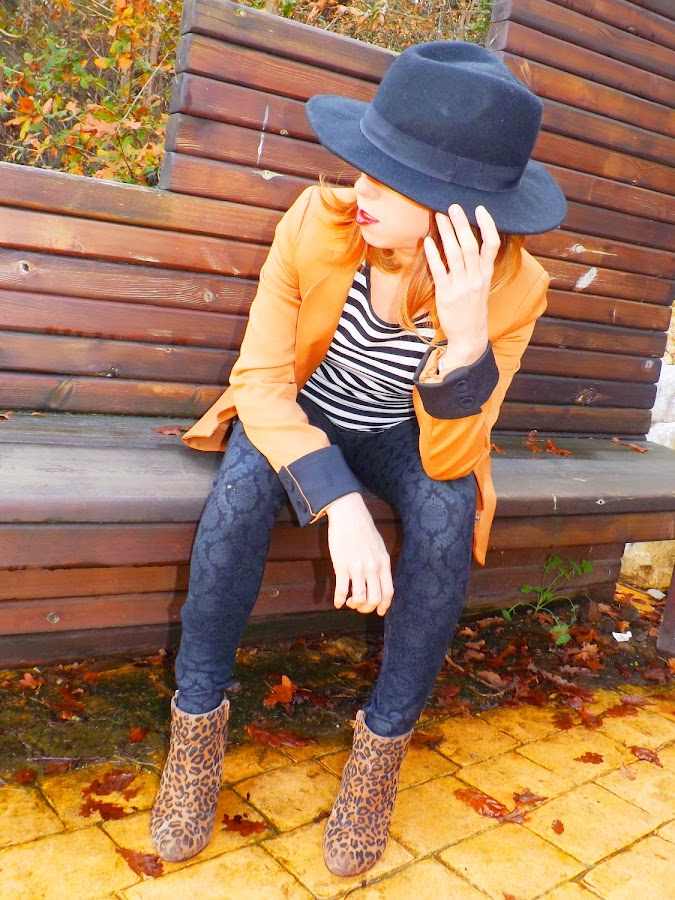 Today I mixed it with a fine striped sweater and printed booties and as always, do not miss my hat. I became a big fan of these accessories, whether beanie or borsalinos, I think they get raise any look.