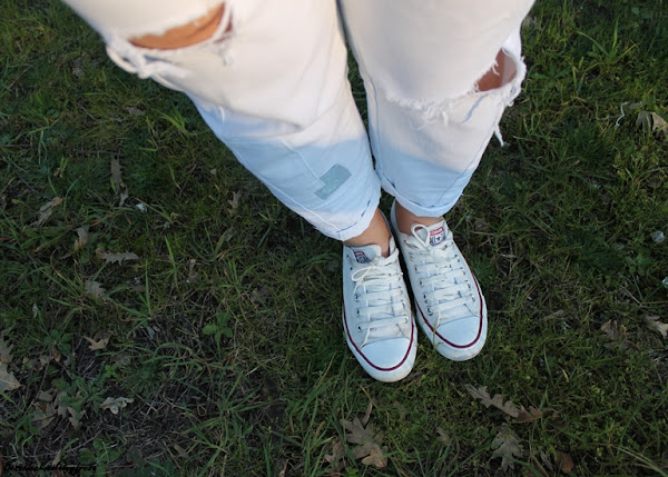 En esta ocasión llevo camisa de antelina en marrón, que me regaló mi chico y al que le gusto hacer dibujos en ella como una foto en la que dibujó un corazón jejeje y mis nuevos boyfriend jeans blancos con rotos, como complementos collar de buho, pulsera de perlas, bolso tote en marrón y converse.
