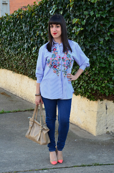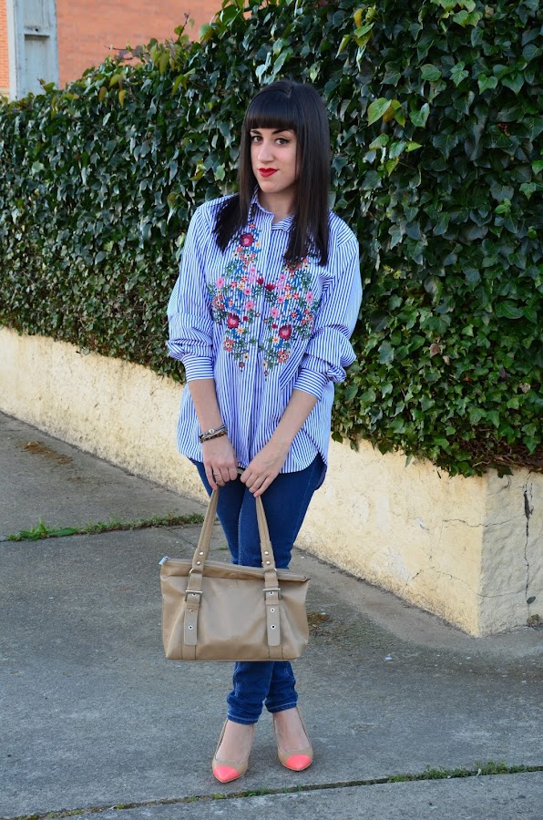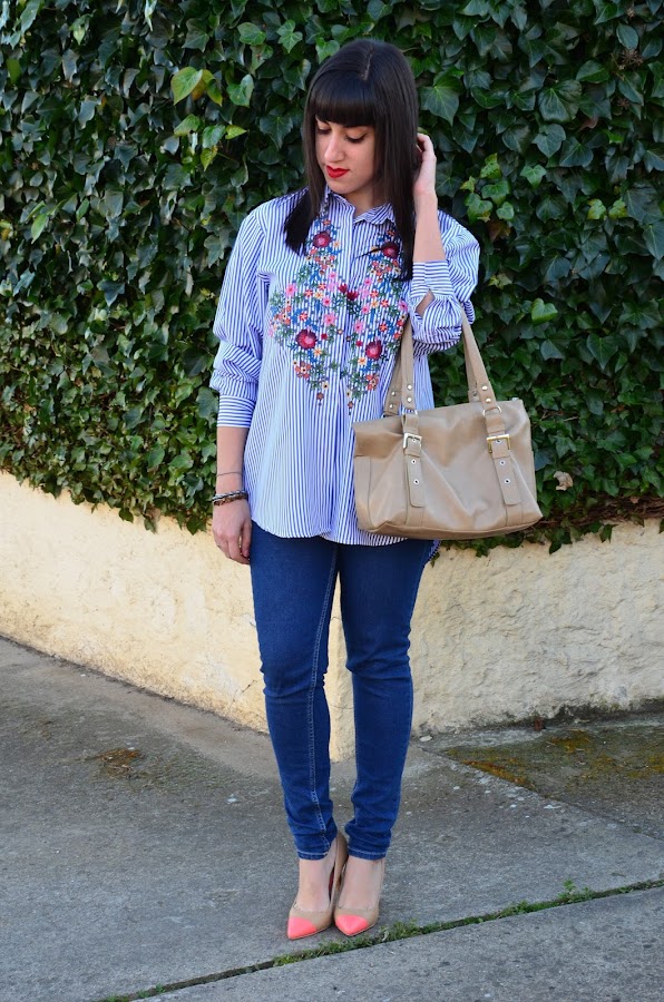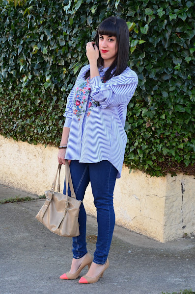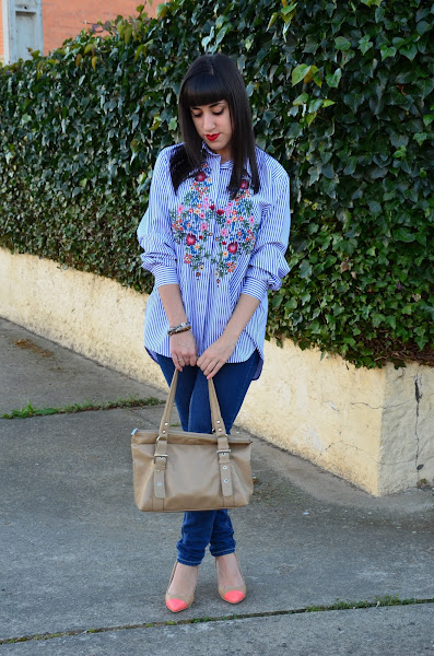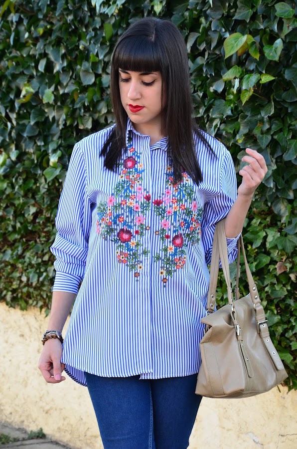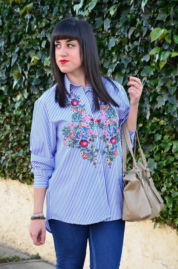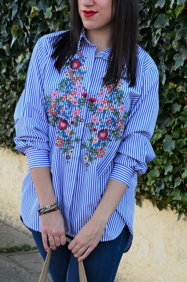 Las camisas de rayas vienen pisando fuerte esta temporada, estoy segura que si os habéis pasado por alguna tienda estas semanas habréis visto que es una de las tendencias de esta primavera y yo me he dejado llevar y he caído con esta camisa de rayas y bordado de flores.