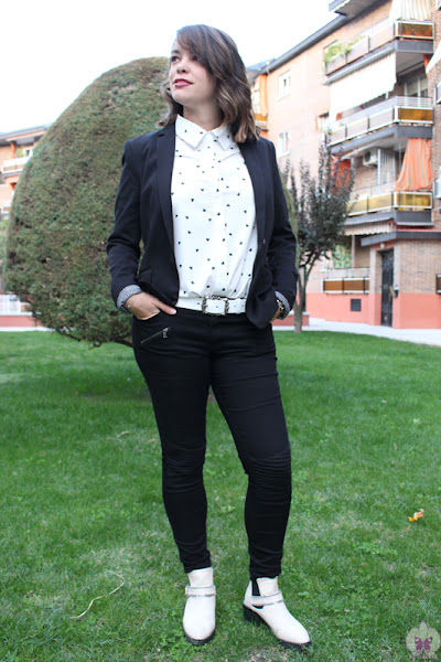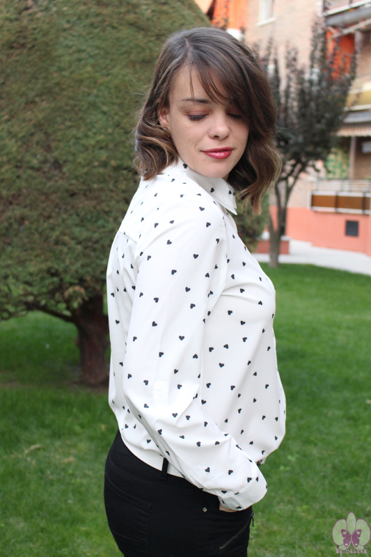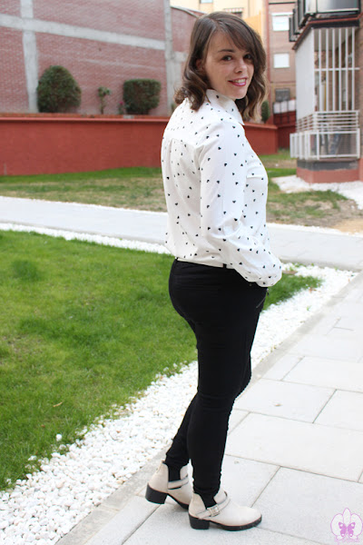Un lunes más vengo con la sección de outfits del blog, y en esta ocasión estrenando mi nueva camisa de Zaful, en blanco con corazones chiquititos negros, que no tenía nada del estilo y me gustó mucho cuando la vi en la web, pero es que cuando la recibí me gustó mucho más, tiene una calidad increíble, un tacto suave y agradable y un buen corte que se adapta a la perfección a la medidas que pone en la web, con lo cual, no me llevé ninguna sorpresa, me queda bien según la talla que pedí.