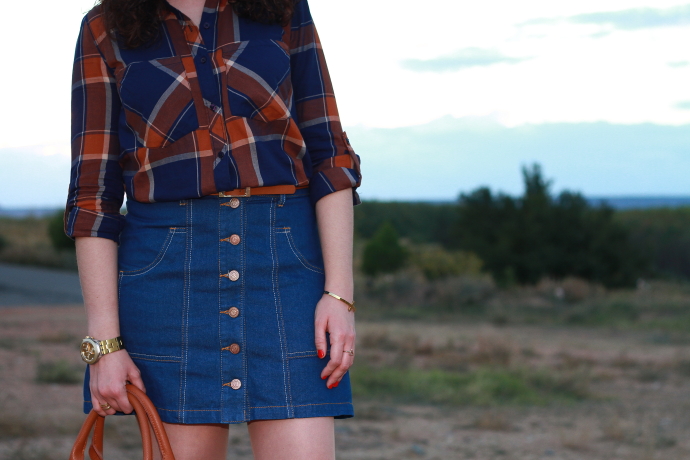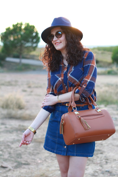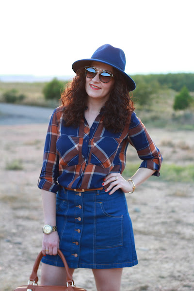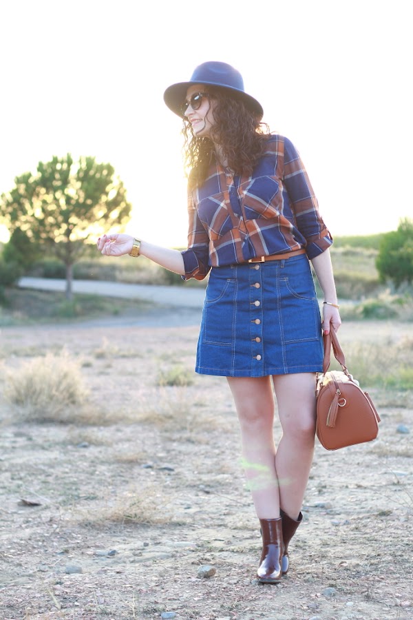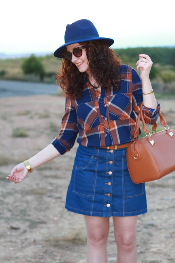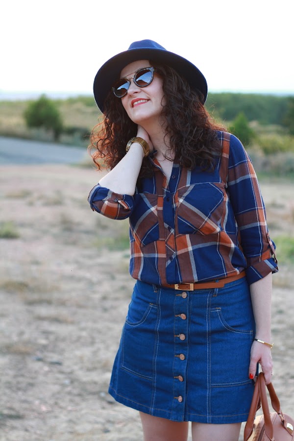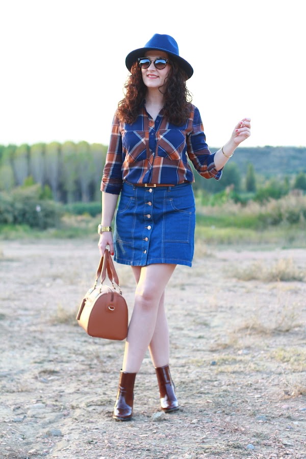 Ya sabéis lo que me gustan las camisas de cuadros y el montón que tengo de ellas. Además, es que es llegar esta época del año y no puedo quitármelas de cabeza. Me encantan para los looks otoñales como el de hoy donde combino una de mis preferidas con una falda tejana abotonada delante. Lo llevo con un sombrero azul, botines de taconazo marrones y bolso también marrón.
