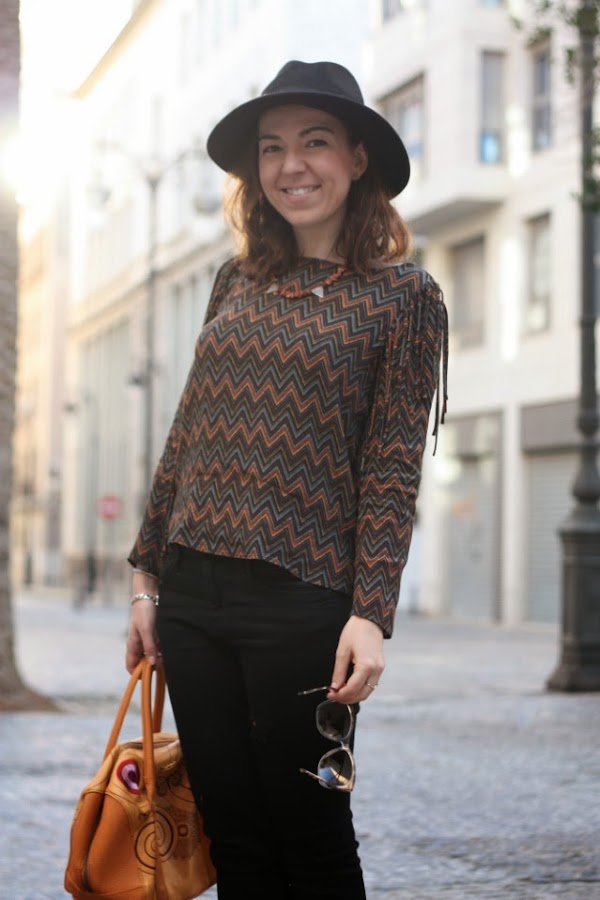 Creo que la prenda más especial del outfit de hoy, es la camisa con estampado Chevron o en zigzag, que tanto me recuerda a una colección pasada de Missoni y que además, está decorada con flecos en los laterales: cuando la vi en la percha, me dio un poco de miedo, pues pensaba que aportarían más volumen del deseado y resultaría poco favorecedora pero la caída de los flecos es perfecta y le da un toque desenfadado ¿no os parece?