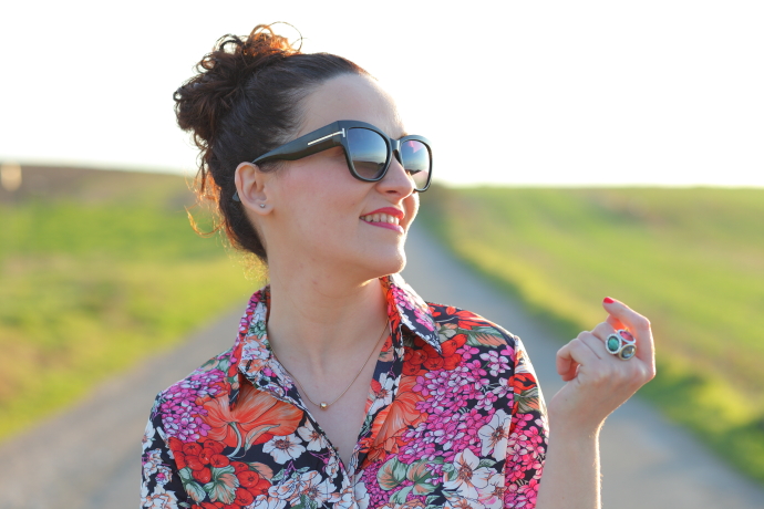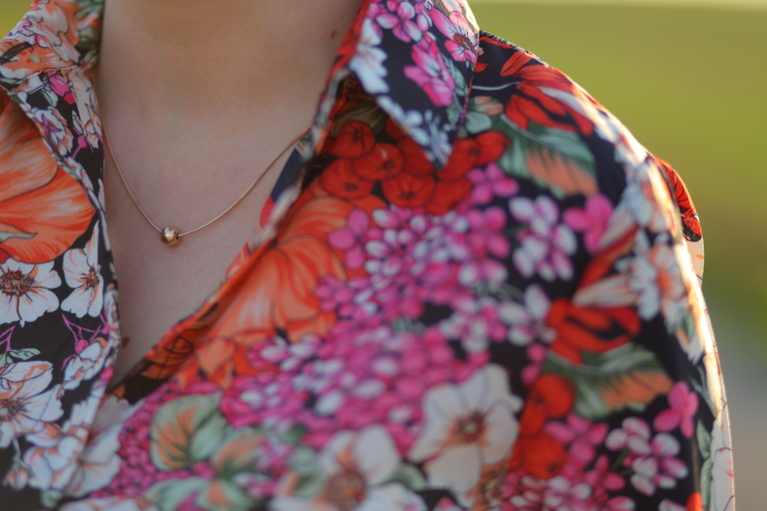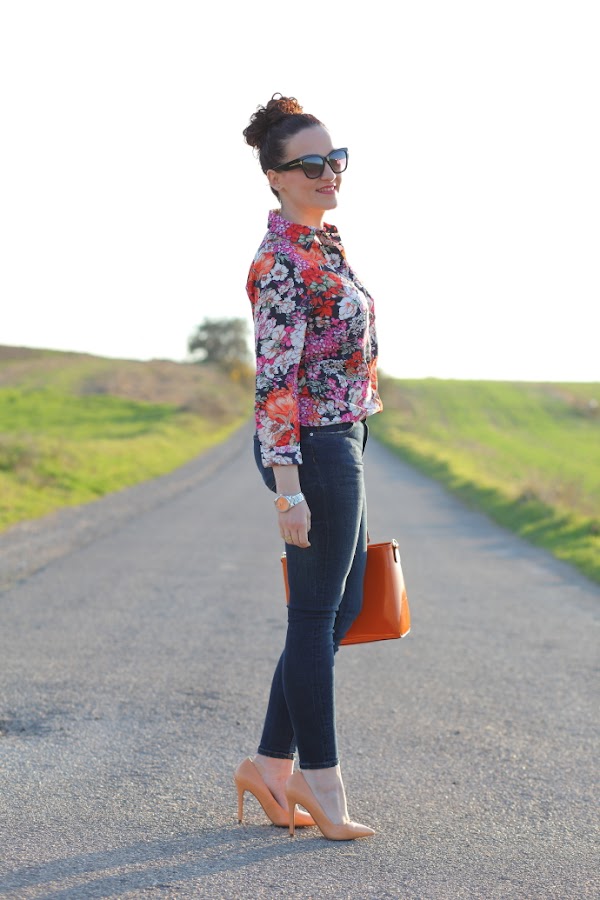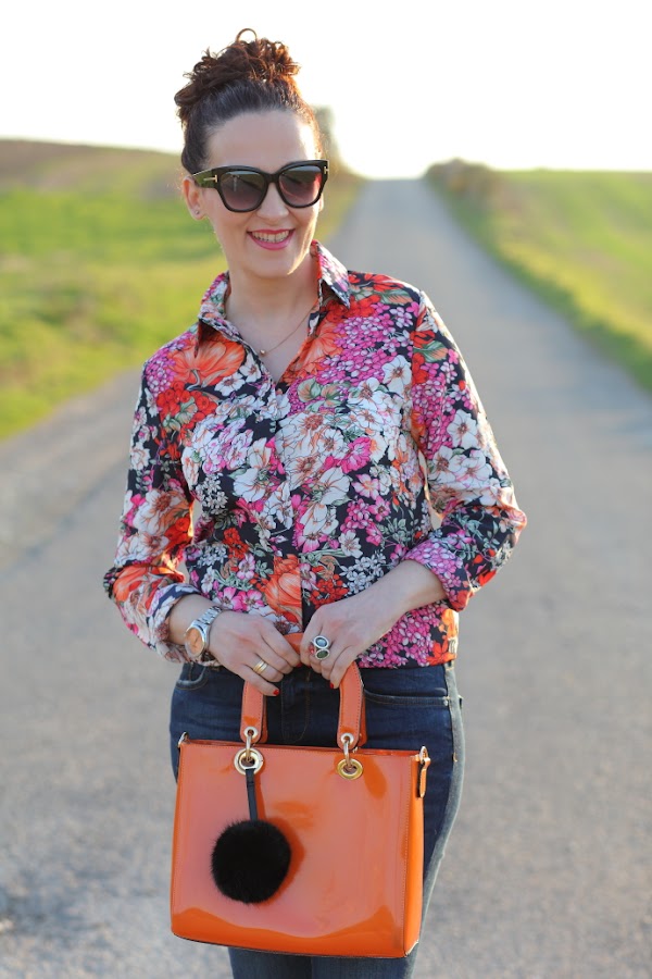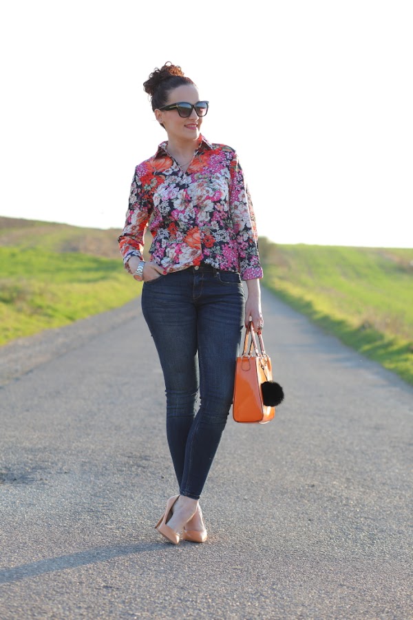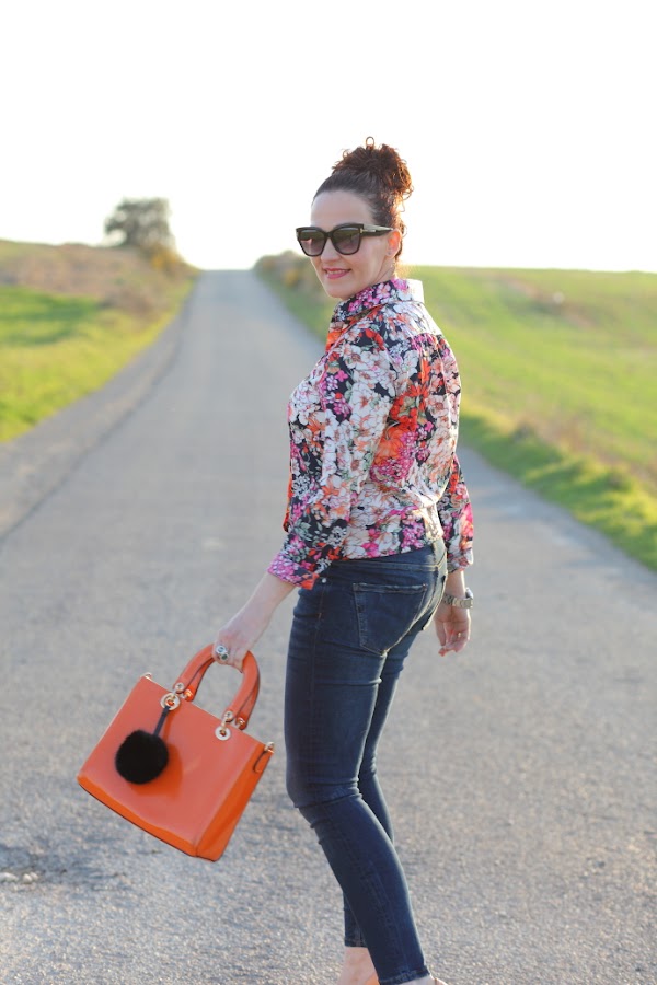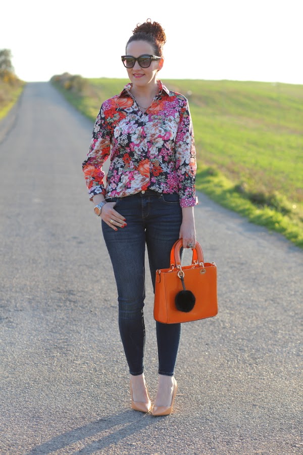 Este invierno los estampados florales con colores vistosos inundaron las tiendas pero en mi caso no me compré nada. Por suerte, este verano van a seguir pegando fuerte y las tiendas siguen estando llenas de ellas, así fue como hace unos días acabé comprando la camisa de flores que os enseño hoy. Tenía claro que al ser una prenda muy vistosa no la iba a llevar mucho y quería algo que no fuera muy caro, por lo que me decanté a comprarla en Newchic. Me encanta el dibujo que tiene, los tonos rosas y anaranjados que combina con un fondo azul marino quedan genial. Decidí estrenarla con mis nuevos jeans tobilleros en azul oscuro y zapatos y bolso en diferentes gamas de naranjas.