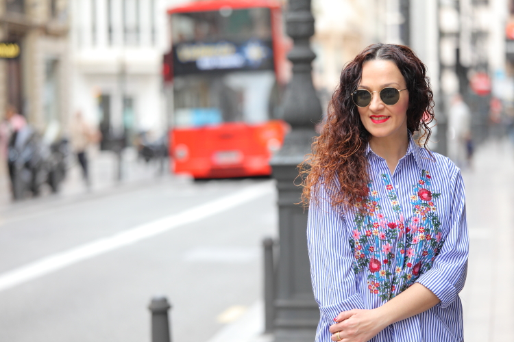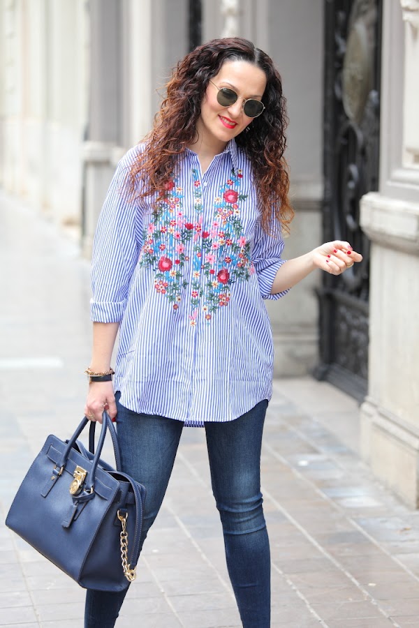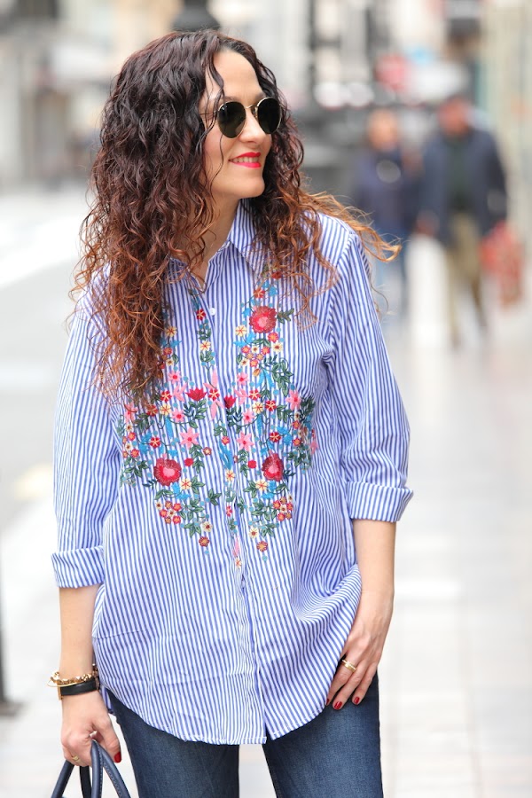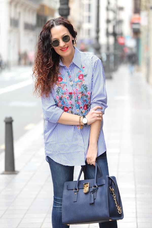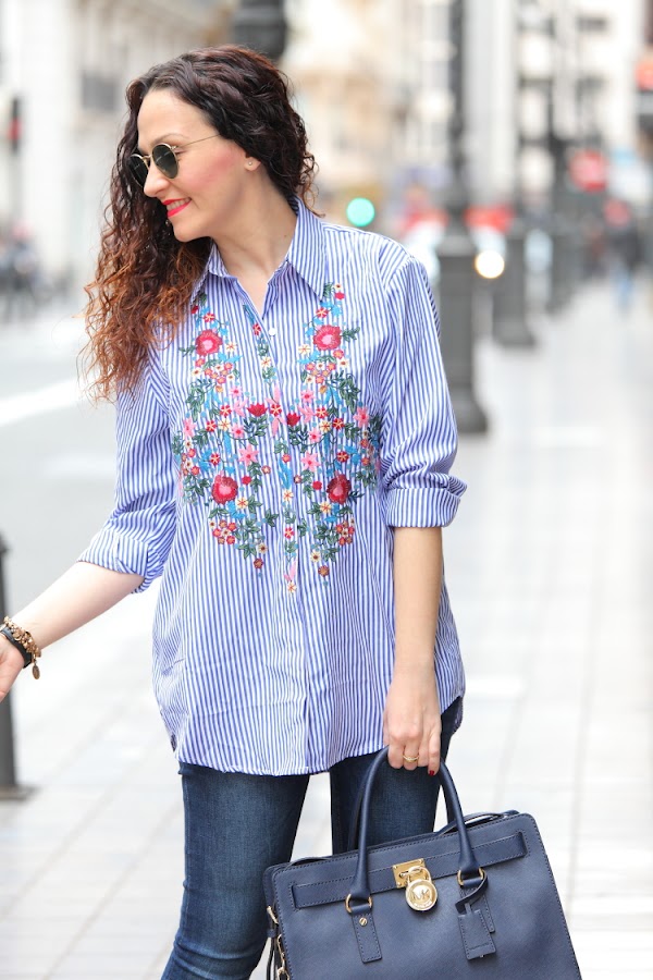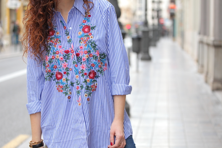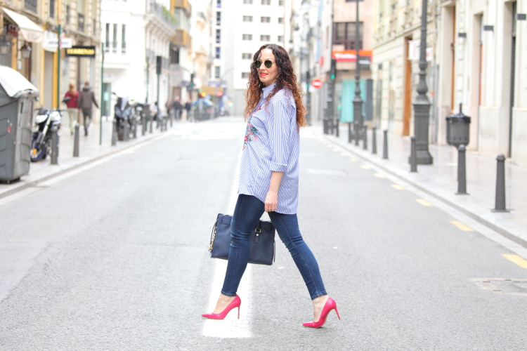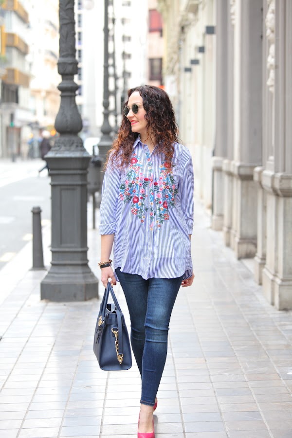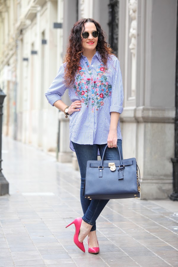 Hoy os enseño mi nueva camisa de rayas y flores bordadas. Desde que Zara la sacó esta temporada me apetecía comprarla, pero como no hago más que comprar prendas azules me resistía. En cambio cuando la vi en Zaful tirada de precio ya no pude resistirme, como veis es exactamente igual que la de Zara y la verdad que la calidad es muy buena Aprovechando que me iba a Valencia la metí en la maleta y este es el look del día que la estrené combinada con jeans pitillos y stilettos fucsias.
