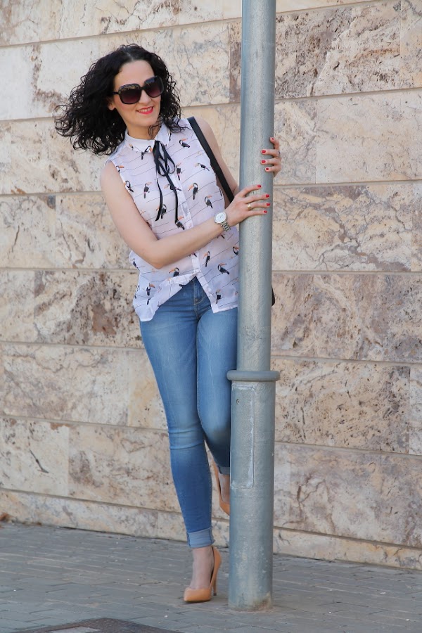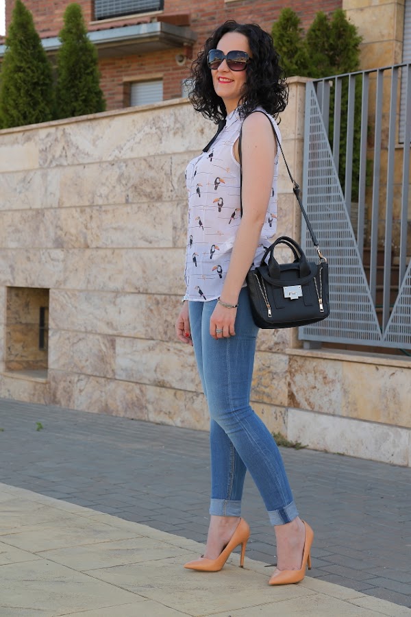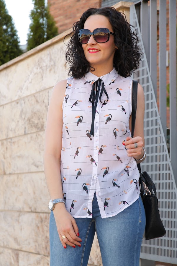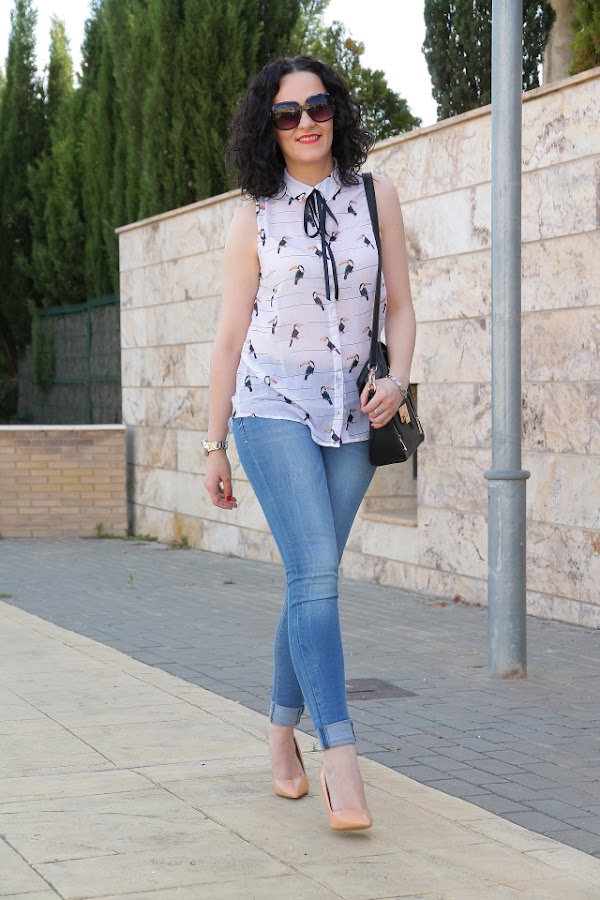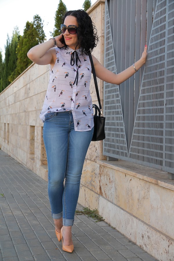 El verano se acaba pero las temperaturas parece que se mantienen e incluso hay días que hasta hace más calor que en pleno agosto. Así que yo sigo aprovechando para llevar ropa veraniega como esta blusa con print de tucanes que me parece una monada. Este día la acompañé con jeans pitillo y lazo al cuello, me encanta como un pequeño lazo le da tanto juego a la camisa. El bolso ya lo habéis visto más veces, me gusta tanto que no me lo quito.