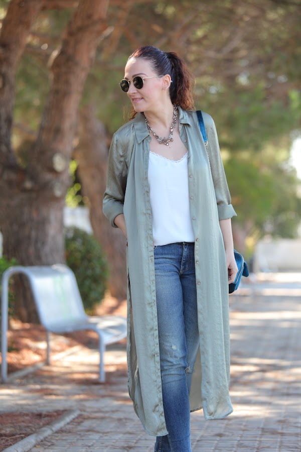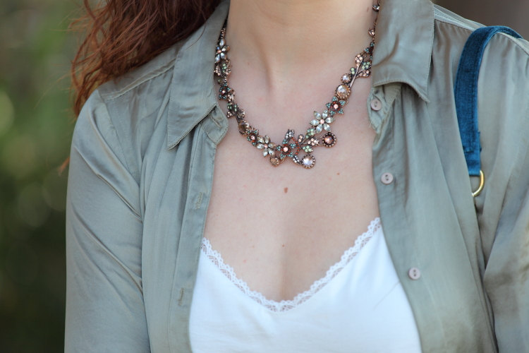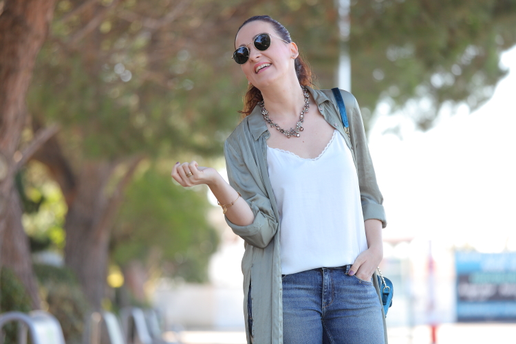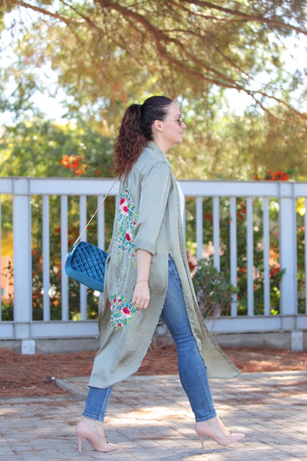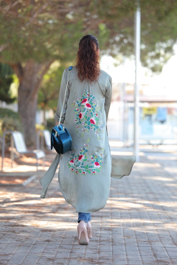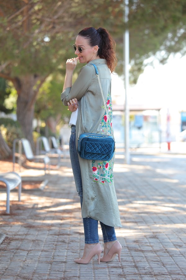 Confieso que cuando compré esta camisa no las tenía todas conmigo de que no la fuera a devolver. Al final no tomé esa decisión porque me gustaba tanto el bordado de la espalda que decidí darle una oportunidad y ahora es que me encanta. Creo que tiene un corte que la hace muy estilosa, además de que combina una gama de colores muy bonitos. Como veis, es de esa clase de prendas que no necesitan mucho más, así que la he combinado con top lencero, jeans y bolso azul petróleo.