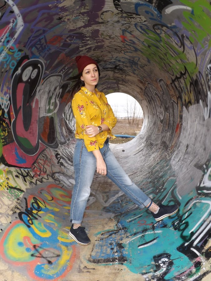 Jeans boyfriend, la camisa anundada y el detalle de los calcetines con topitos a la vista.