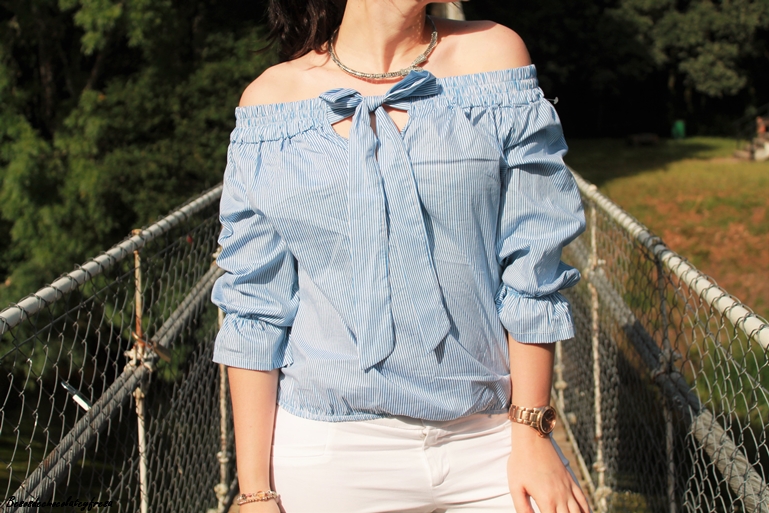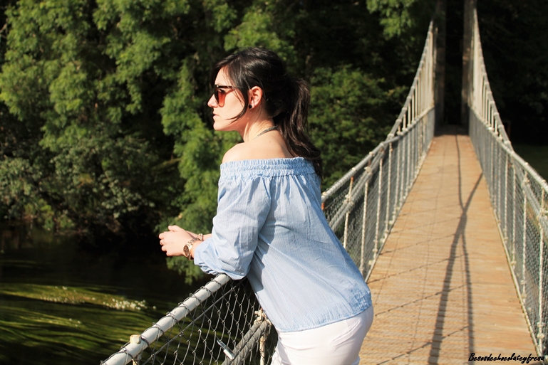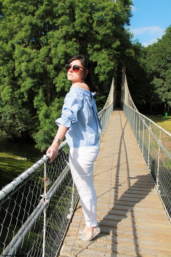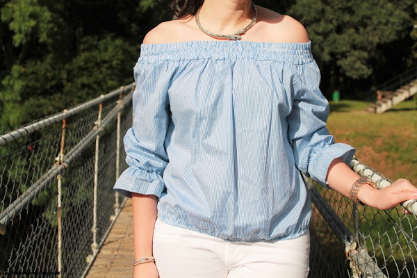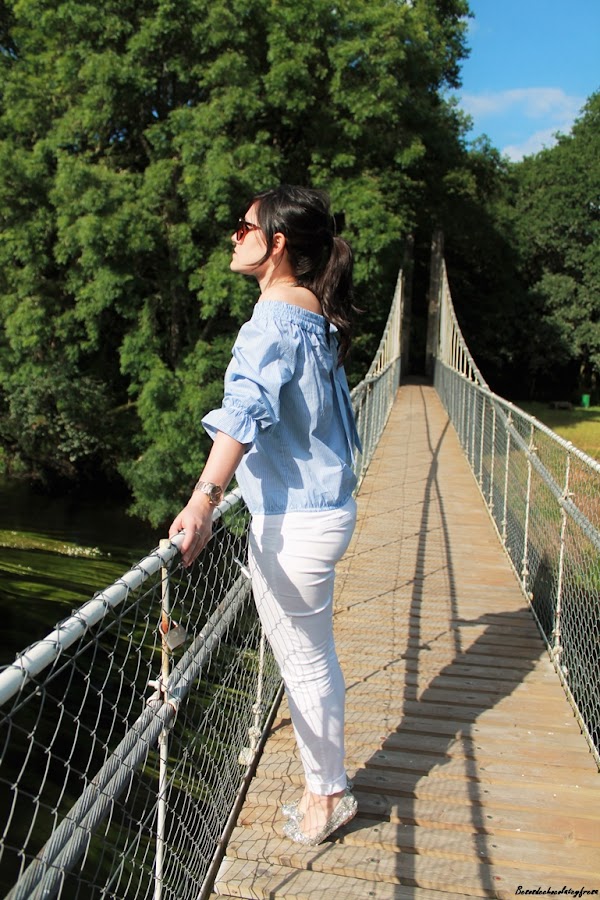 Hoy os muestro un look en tonos azul y blanco, concretamente con esta blusita reversible de mi tienda online, cómoda de llevar con 2 tendencias en 1, por una parte hombros al aire tan de moda este verano y las rayas que nunca nuca pasan de moda. Tienen volantes en las mangas y lazada que puede ir tanto hacia delante como hacia atrás que permitirá crear dos looks diferentes. La teneís disponible en la web en talla única.