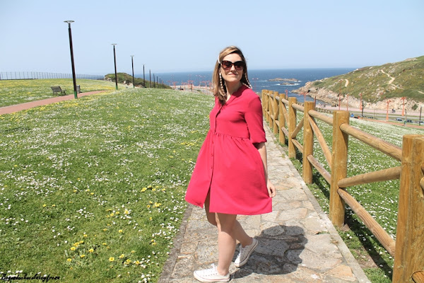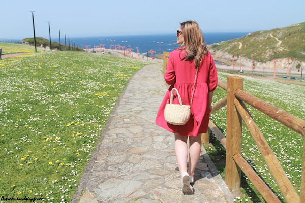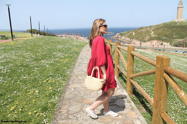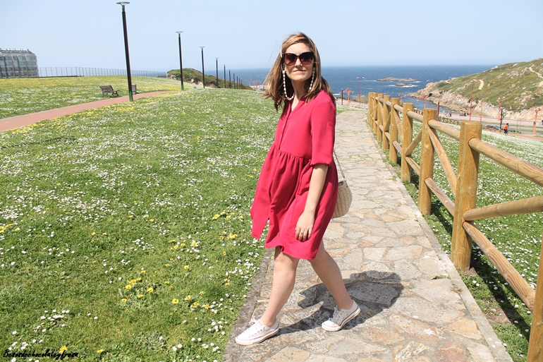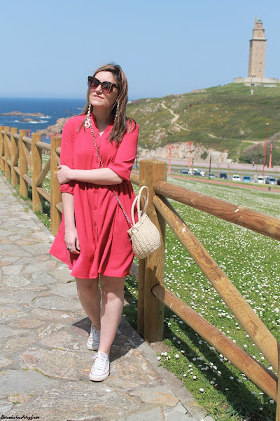 En el outfit de hoy os muestro este modelo de vestido camsiero en color rosa fucsia tirando a frambuesa. Super favorecedr una vez empecemos a coger tono en la piel. Lo combiné de manera casual para pasear por la ciudad, con sneakers en blanco, chaqueta denim y capazo de mimbre con cadena dorada.