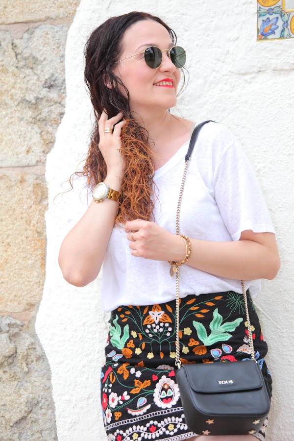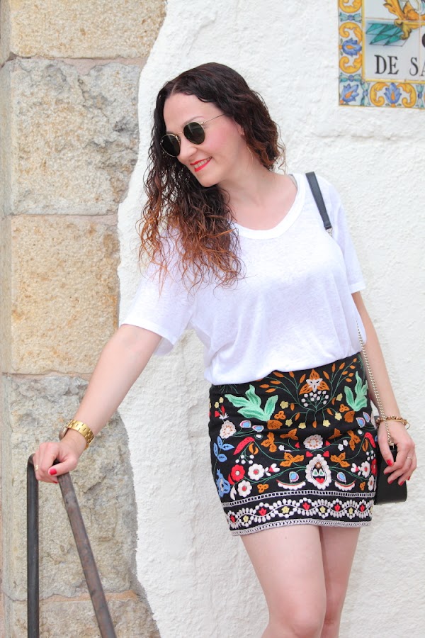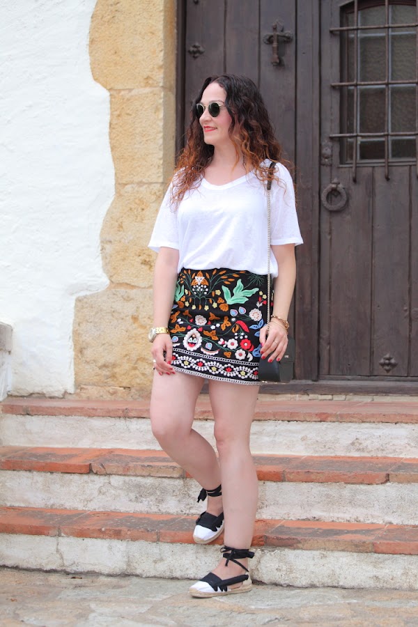 Último look de mis vacaciones en la Costa Brava. Un estilismo muy casual que gana puntos gracias a la falda bordada que compré justo antes de las vacaciones. Solo puedo decir que me encanta, desde entonces la he llevado mucho tanto en looks relajados como el de hoy, a otros más chics con tops lenceros. Además, tengo ganas de vérmela puesta este invierno con jersey gordito de punto, media tupida y botines, estoy seguro que quedará genial. Otra de las cosas que me gustan de este outfit son las esparteñas, llevo las que nos ponemos en Aragón con nuestros trajes regionales de jotera. Me encanta que este verano las podamos llevar en nuestros looks de calle.