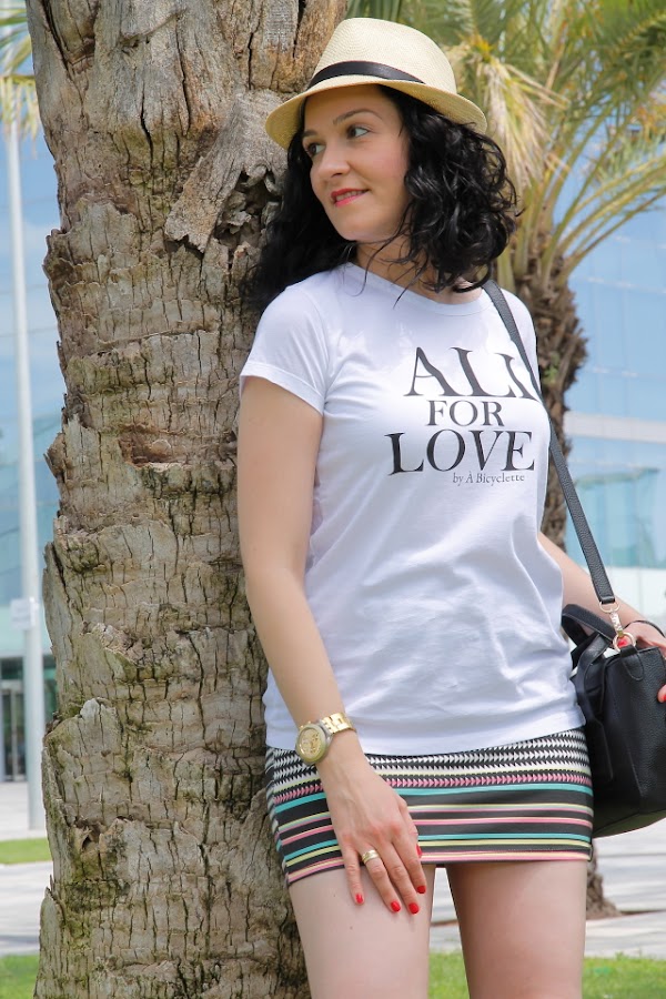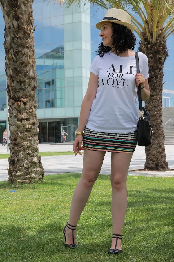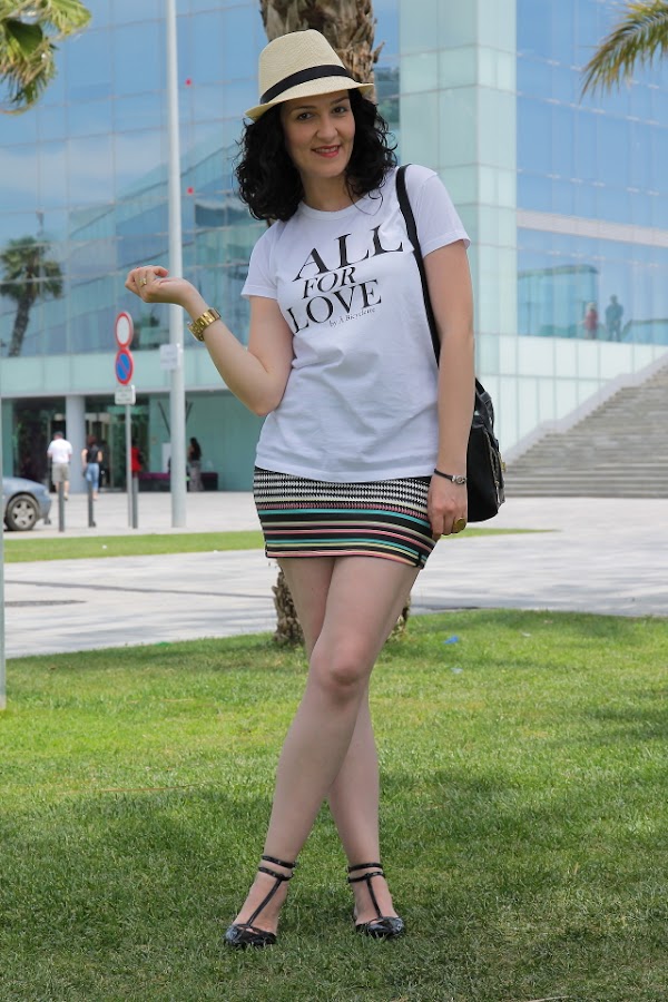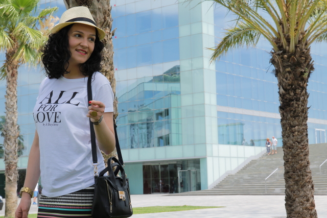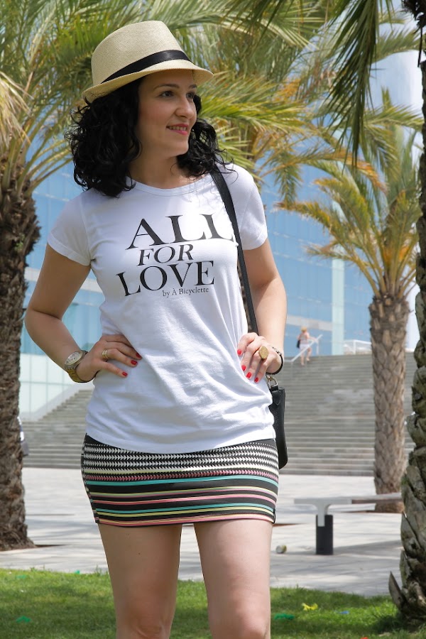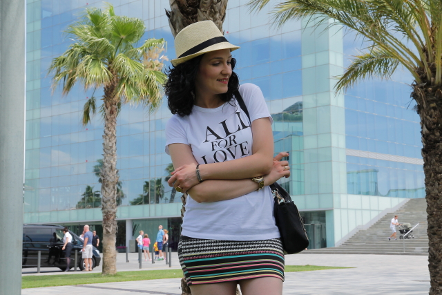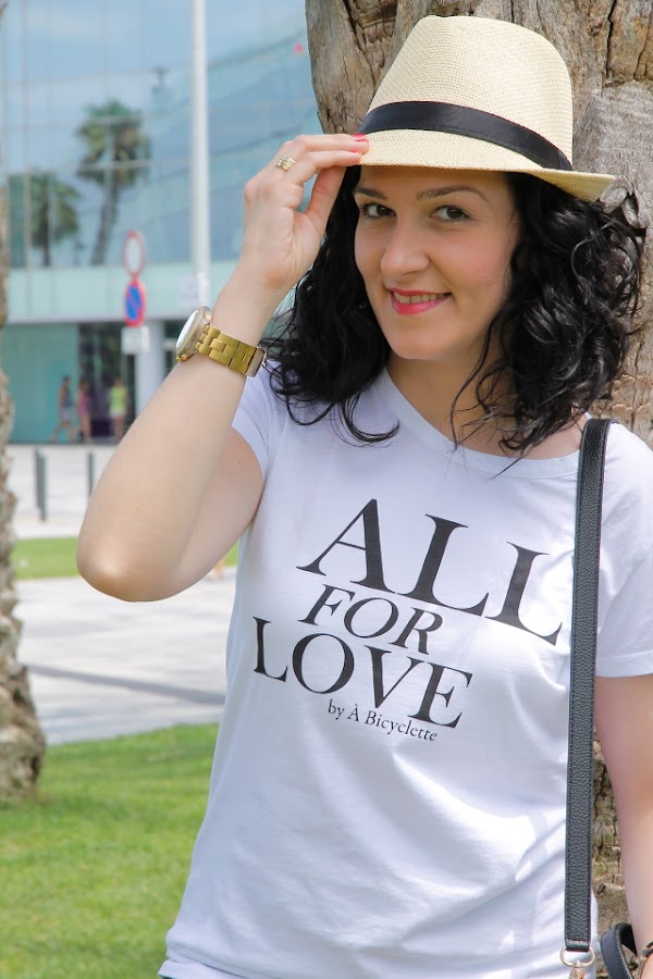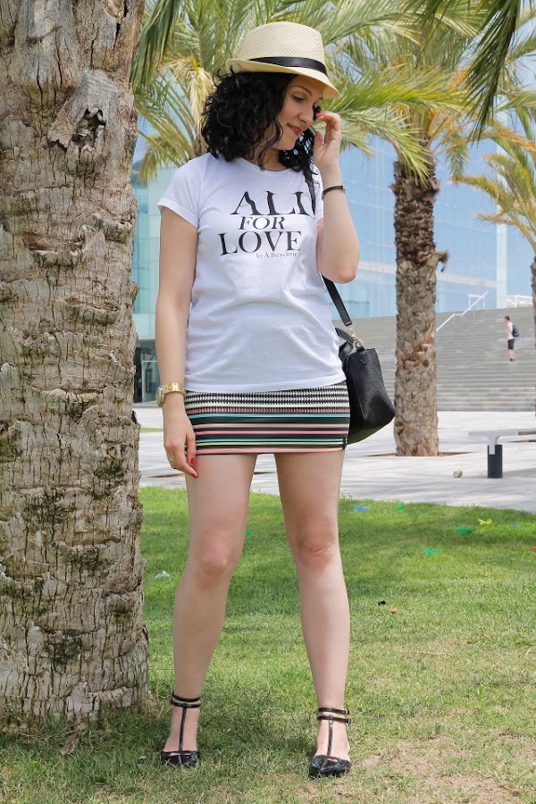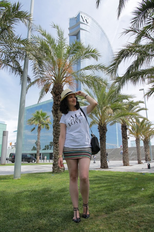 Me encanta la ropa de A Bicyclette, por eso cuando estuve en la tienda de Nineta Sabadell disfruté muchísimo probándome cositas de esta marca. La camiseta con mensaje y la falda de tubo étnica que llevo hoy son algunas de las prendas que se vinieron conmigo. Este día decidí ponérmelas con mi nuevo sombrero y sandalias planas de charol para disfrutar de un agradable día en Barcelona con mi marido paseando por la playa para terminar comiendo en un restaurante fantástico.