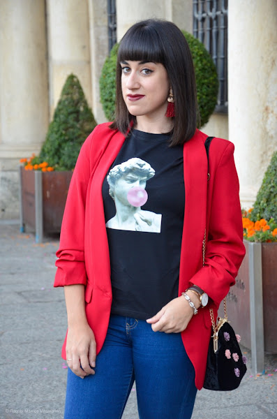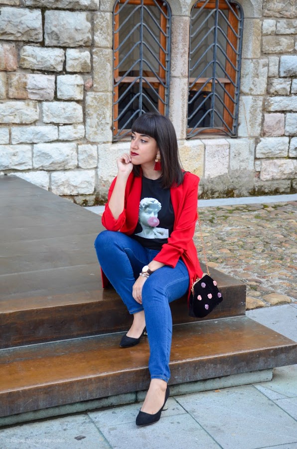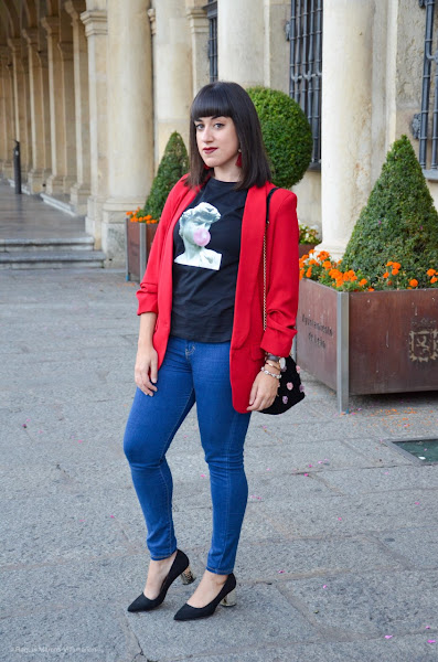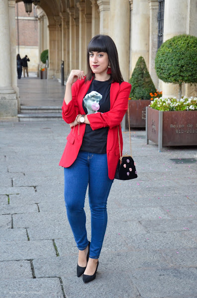 La he combinado con blazer rojo para que le diera un toque de color, que para estos días tan oscuros parece que hace falta. No se a vosotras, pero a mi me encanta combinar camisetas originales con blazer para darles un toque más desenfadado a las chaquetas.