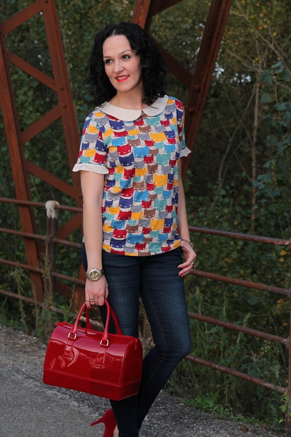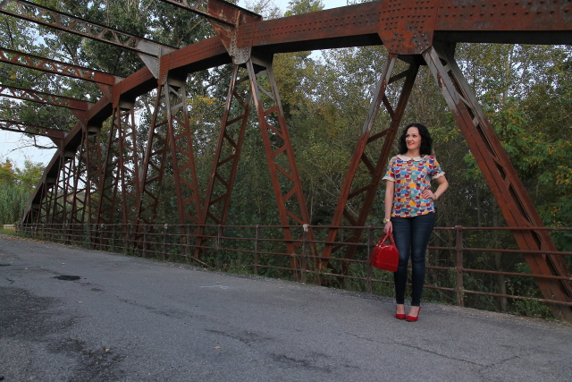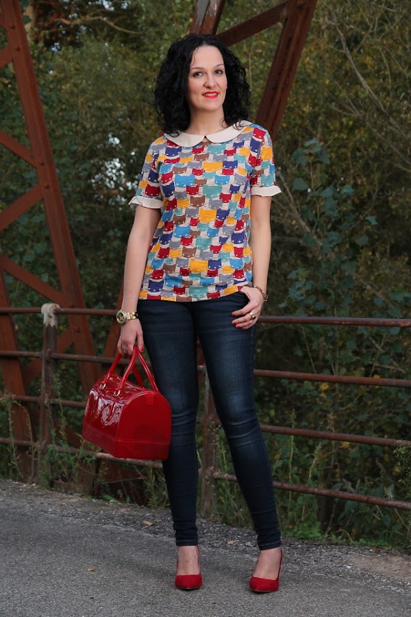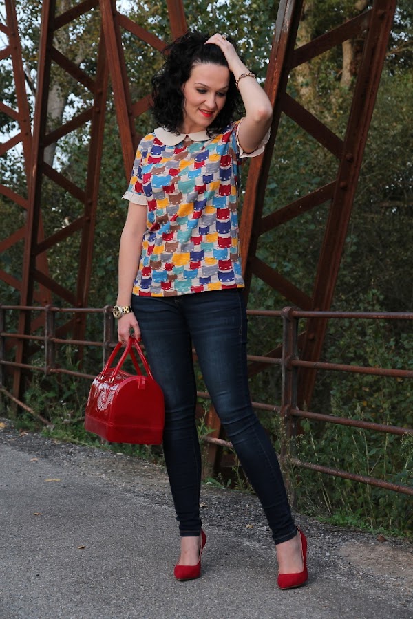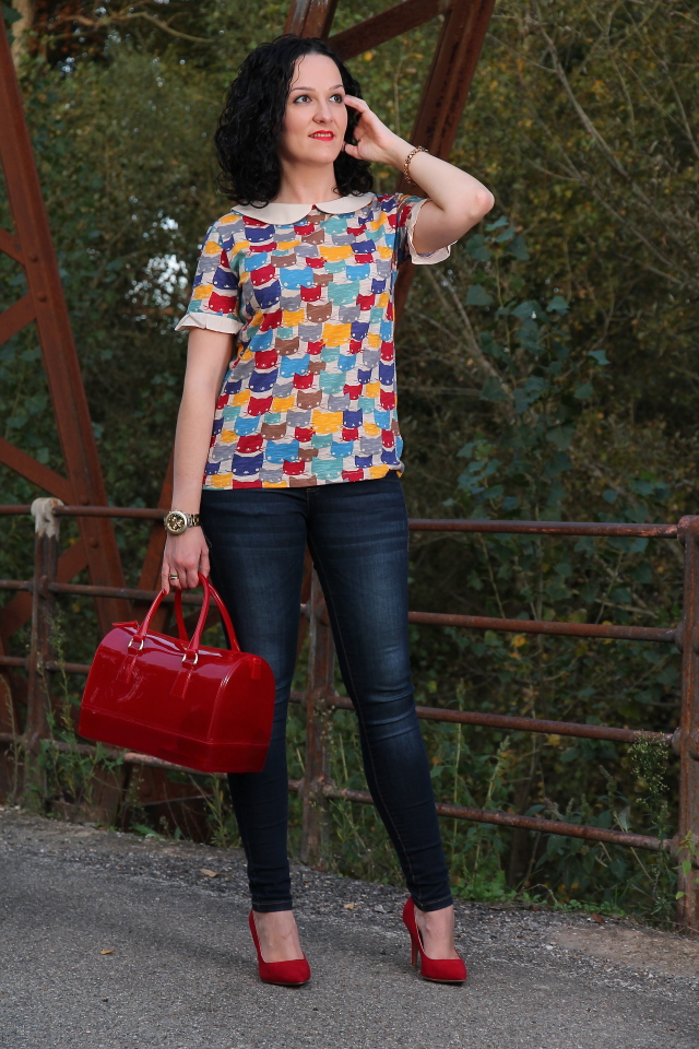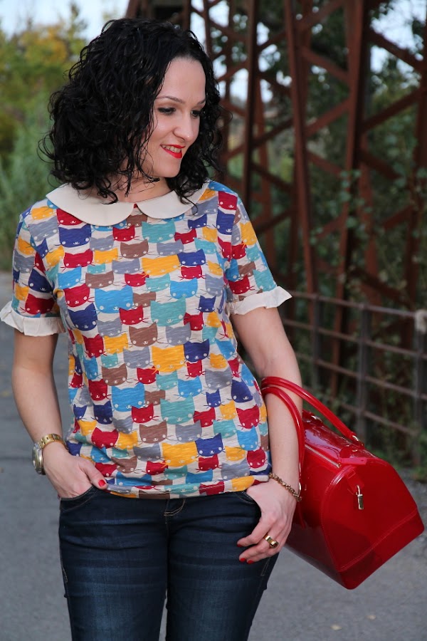 No se que tiene el estampado de gatos que siempre me conquista. El año pasado ya os mostré aquí un outfit con un vestido con este estampado y hoy os enseño el look que llevé el domingo con mi nueva camiseta de gatitos de Pepa Loves. Su colorido junto con el cuello y los volantitos de las mangas le dan un toque muy bonito y dulce. La he combinado con pitillos azul oscuro para resaltar el estampado y he dejado el rojo para los complementos. Con lo que me gusta esta camiseta y las múltiples combinaciones a las que se presta estoy segura que la veréis más veces por aquí.
