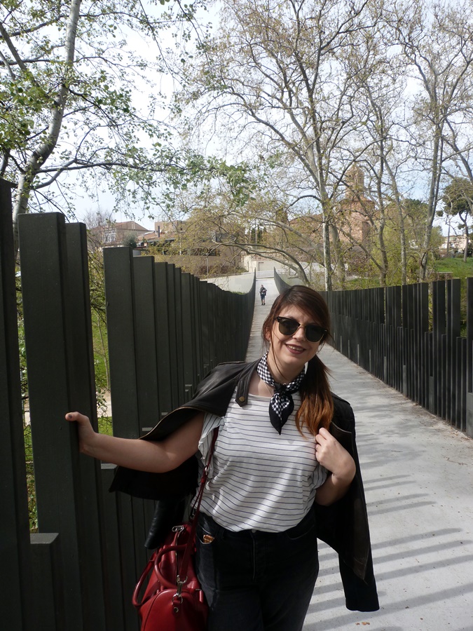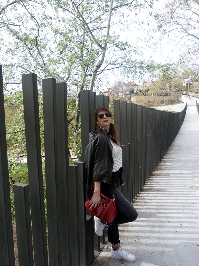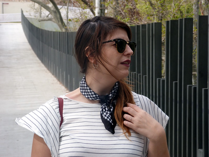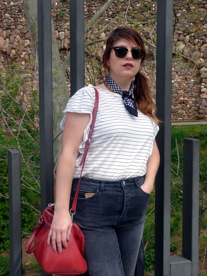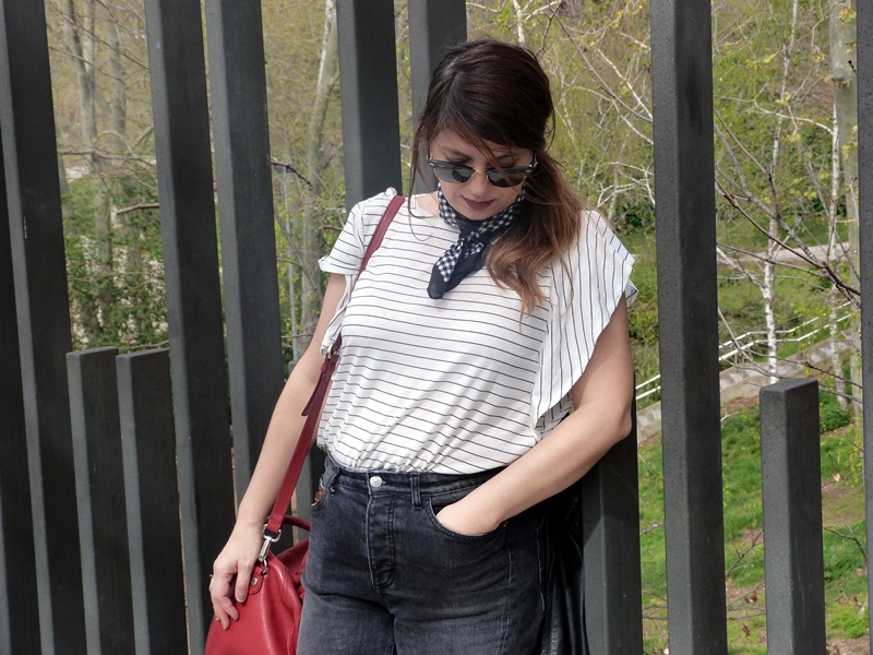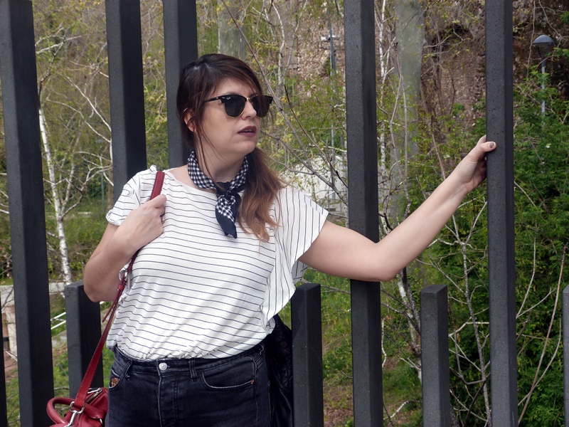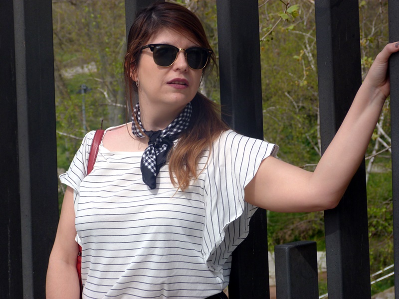 Hoy os traigo un look más fresquito, las temperaturas ya son más cálidas, pero aunque algún que otro día nos sorprende con lluvia podemos disfrutar de un agradable tiempo, así que aproveché para estrenar una camiseta de volantes en las mangas y de rayas de MNG que combiné con un pantalón tejano negro, bambas y como complementos pañuelo de cuadro vichy al cuello. espero que os guste.