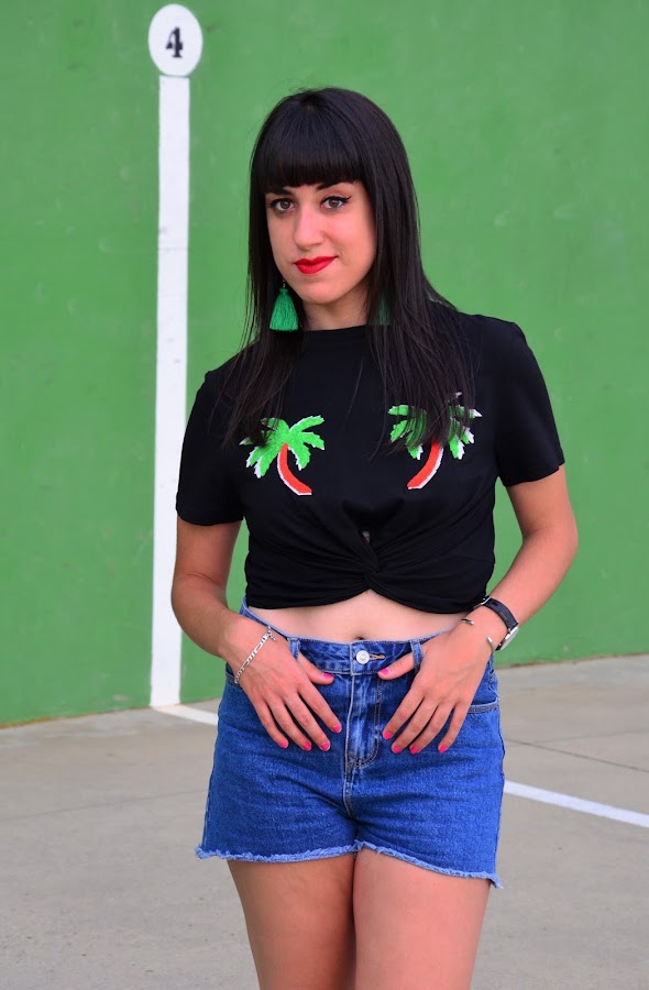 No pensaba hacerme con ninguna prenda con palmeras pero hice una excepción con esta camiseta de Zaful . Pensé que iba a ser un poco mas larga pero una vez la vi dije "que mas dará, si estamos en verano" y es que es cómoda, fresquita, divertida... y ademas con unos shorts high waist tampoco se ve excesivamente corta.