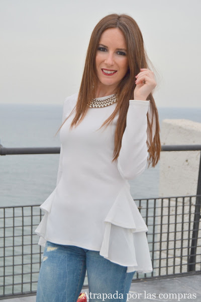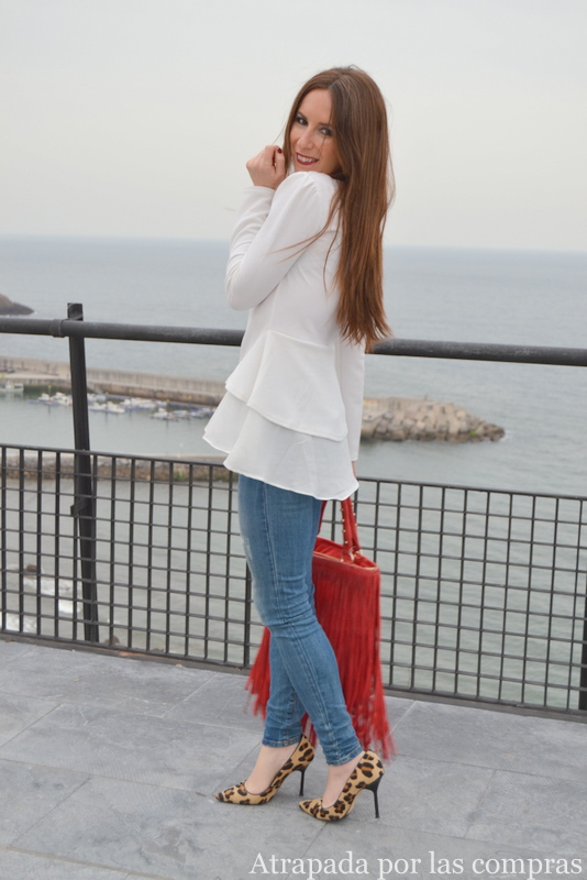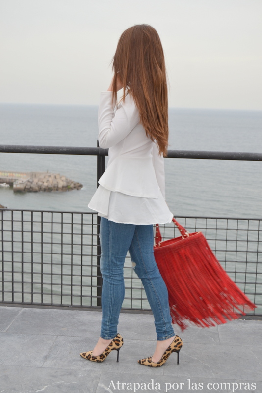 El look de hoy es un look sencillo, de esos que te sacan de un apuro cuando no sabes qué poner pero tiene algo especial. Por un lado unos ripped jeans, ya sabéis que están de absoluta tendencia y por otro una camiseta blanca, pero no una camiseta blanca cualquiera, una camiseta blanca peplum. El toque de color lo aporto con el bolso de flecos rojo que he rescatado del olvido, esta temporada que los flecos son lo más me lo veréis bastante, y con los zapatos print animal. Qué os parece el look?