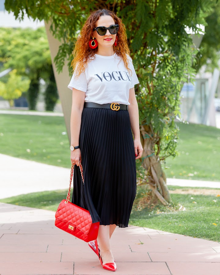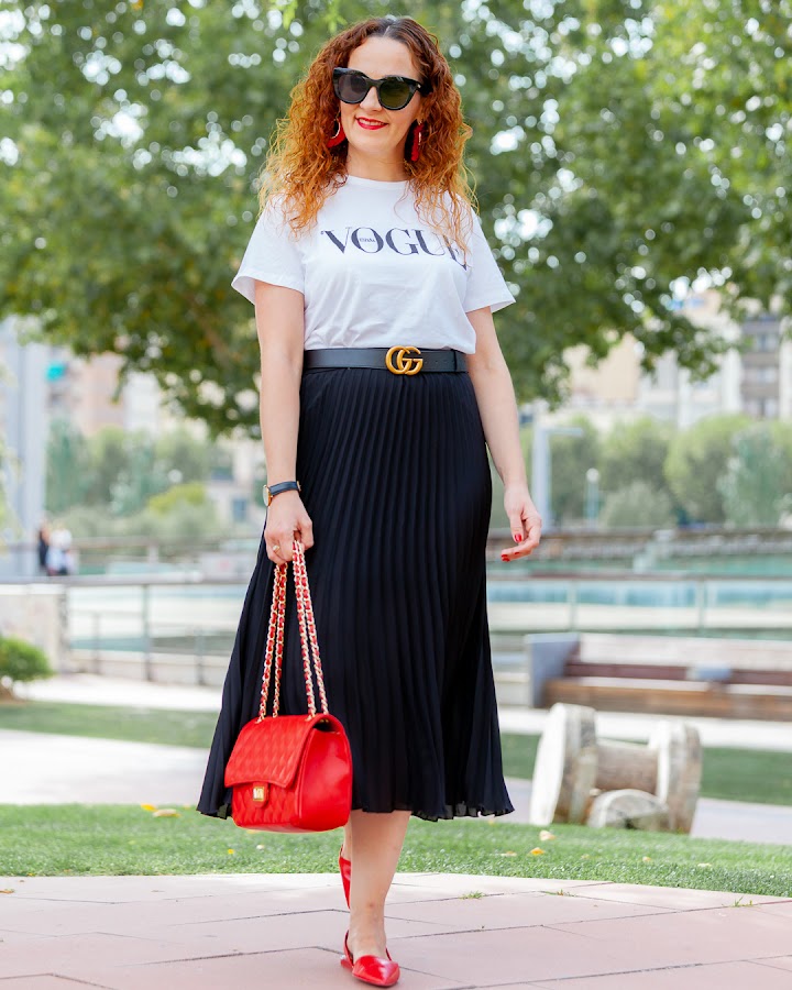 Sí, yo también tengo la camiseta de Vogue, pero es que aunque no tiene nada a mi me encanta. Hoy os enseño como la combiné el sábado pasado para disfrutar junto a mi marido de un día bastante completo en el que no pisamos nuestra casa hasta que nos fuimos a dormir. La llevé con un look muy cómodo compuesto por una falda midi negra que estrenaba ese día y complementos en rojo.