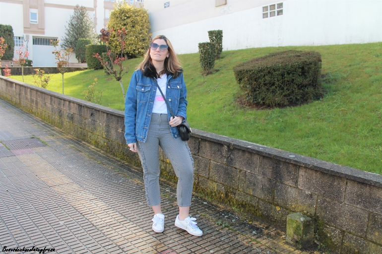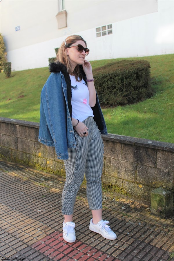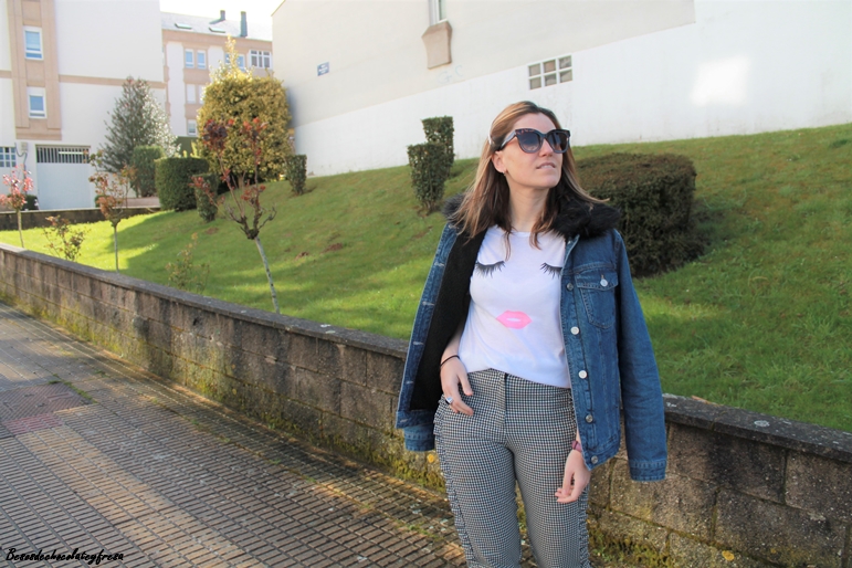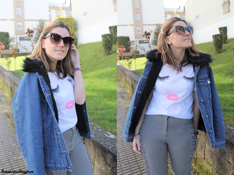 En este caso combine pantalones de cuadro vichy y volantes en laterales que ya enseñe en más de una ocasión, esta vez con una camiseta molona, sencilla pero que tiene un toque chic, de trata de unos ojos y unos labios en rosa y en negro.