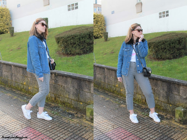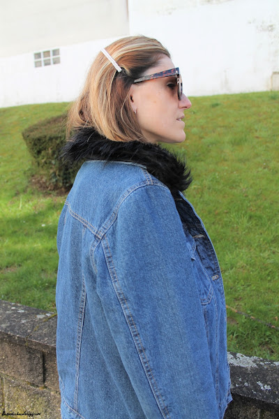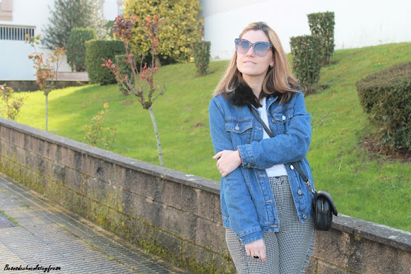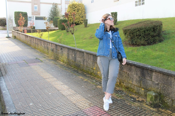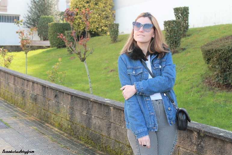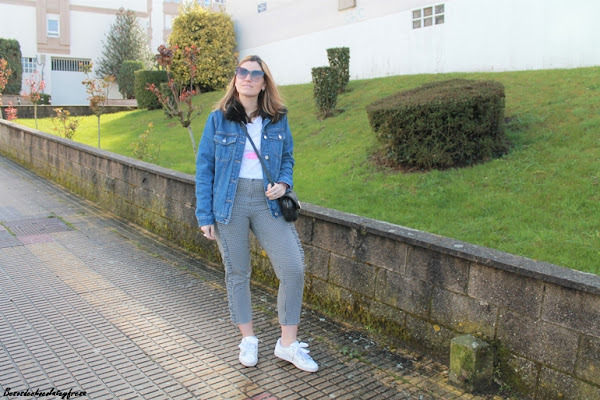 Sneakers en blanco y cazadora denim con peluche y pelito en las solapas color negro a juego con el bolso.