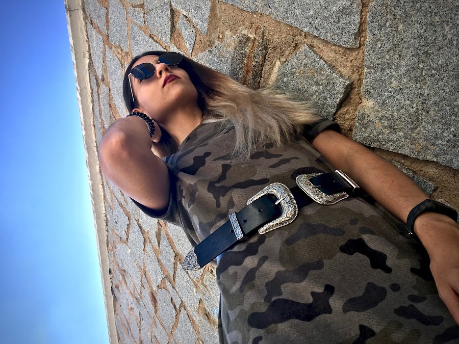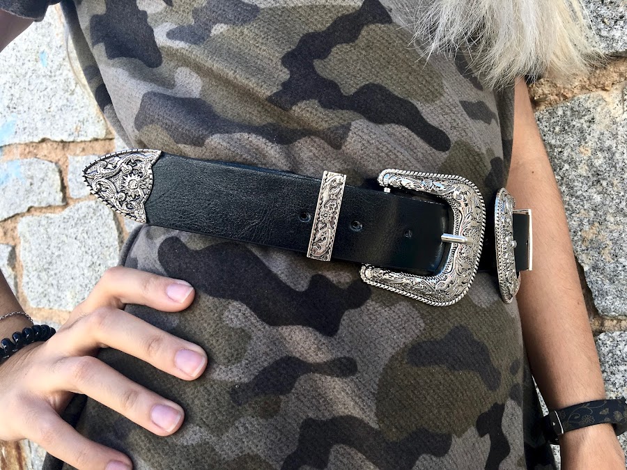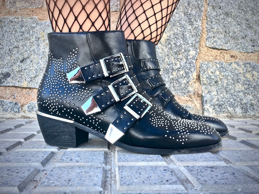 Lo he combinado con un cinturón negro de dos hebillas para darle un toque rockero y mis botines de hebillas y tachuelas de JESSICA BUURMAN.