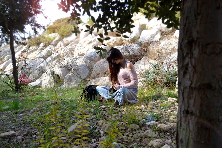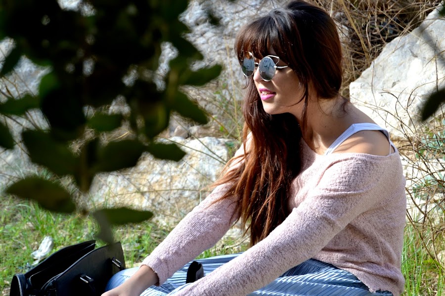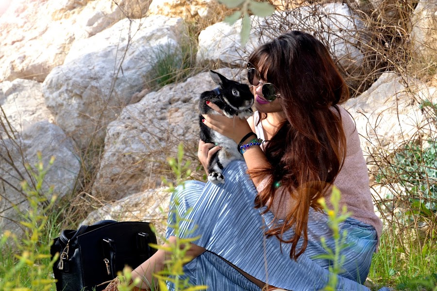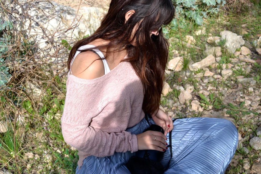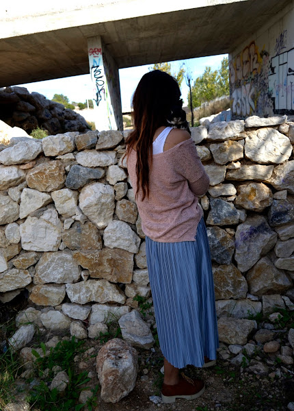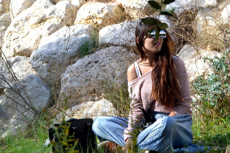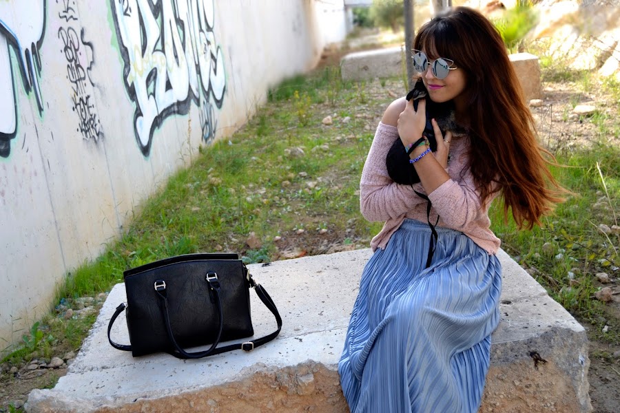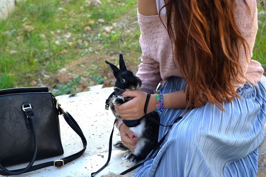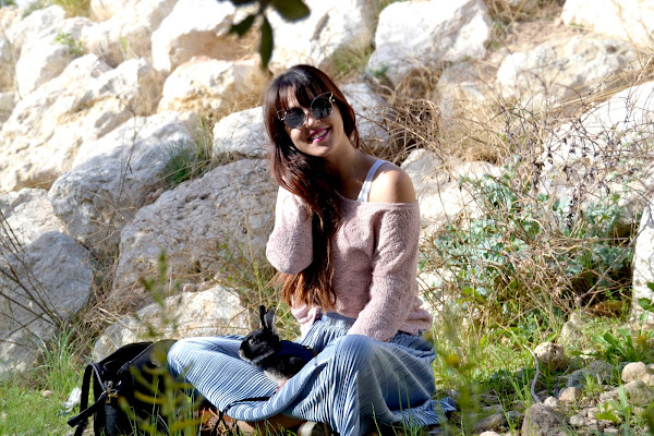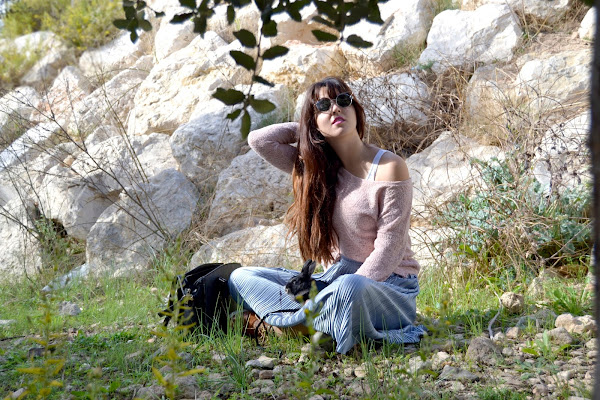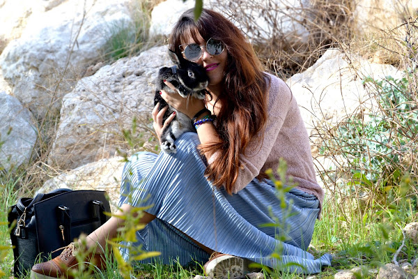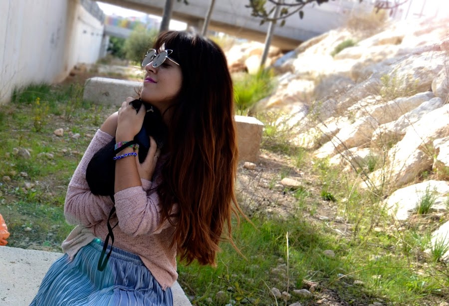 En cuanto al outfit, he sacado -otra vez- de mi fondo de armario esta preciosa que falda midi que tanto me encanta, un suéter rosa palo y crop top blanco por debajo, me gusta el efecto que da con el suéter ladeado y que se vea el top por debajo. Para combinarlo -a parte de mi conejito hahaha- estas oxfords marrones que ya tan estropeadas están del trote que les he dado, ¡y lo que les queda!, gafas polarizadas que ya habéis podido ver en otros posts (AQUÍ) y (AQUÍ). Y este bolso negro que era el único en el que me cabía la cámara hahaha.