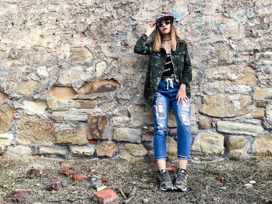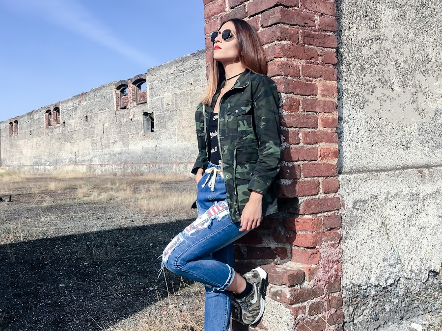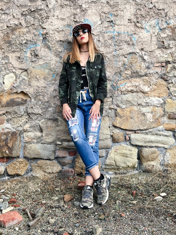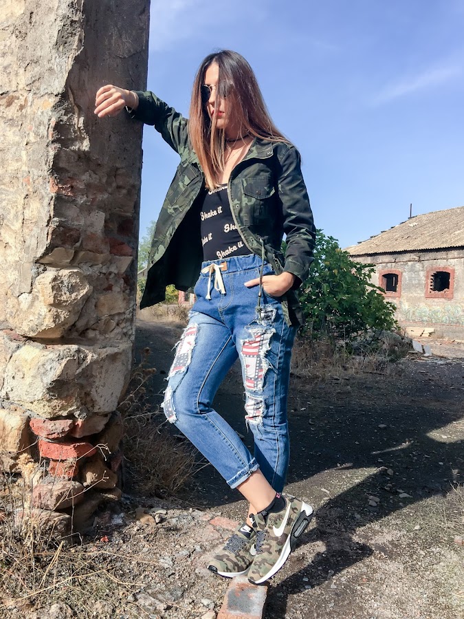 La he combinado con mis distressed jeans que ya habéis visto anteriormente, mi body Shake it y mis zapatillas de camuflaje.