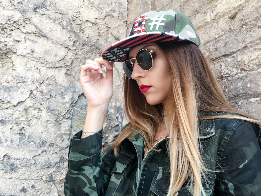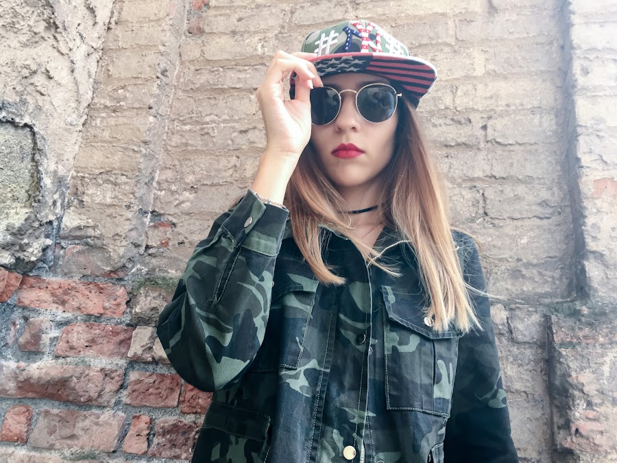 Como complementos, unas gafas de sol preciosas y una gorra también de camuflaje.