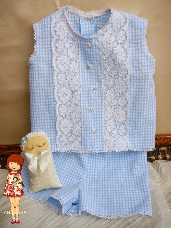 Este trajecito de algodón en cuadritos de vichí ,blanco y azul-cielo, se lo hice para el sobrino-nieto de mi marido , y para hacerlo utilicé dos patrones que hemos utilizado un montón de veces en este blog para distintos modelos