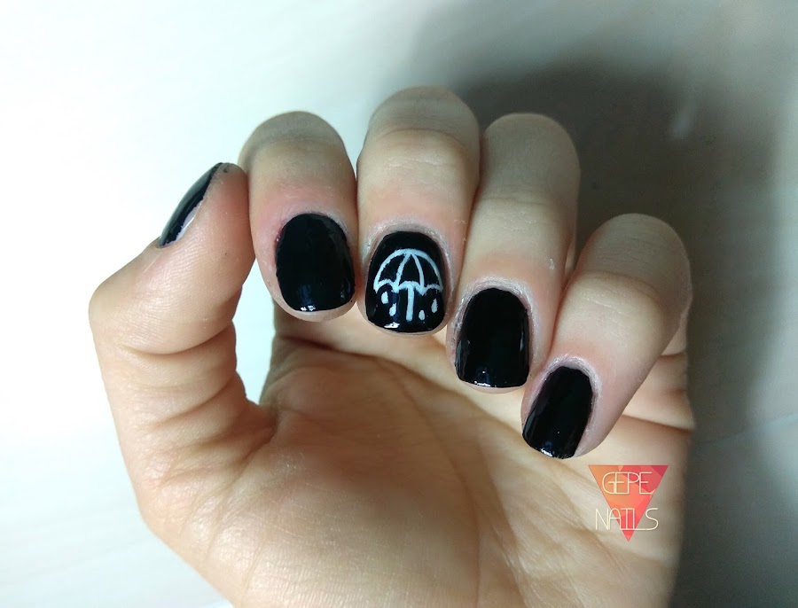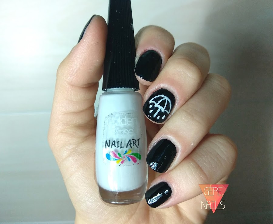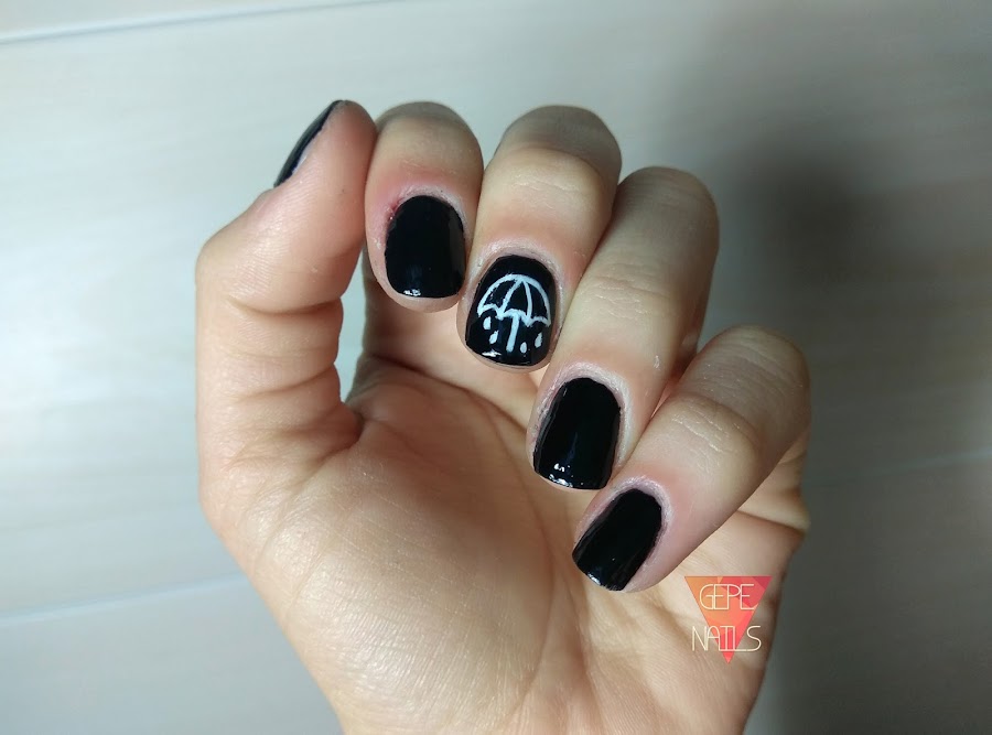 La manicura es muy sencilla. Es una base negra, y un dibujo a mano alzada. Yo lo he hecho con el esmalte especial nail art de Golden rose. Viene genial porque tiene el pincel super finito, ideal para hacer detalles pequeños, incluso las gotas. Además, al ser tan largo, facilita un montón hacer las curvas.