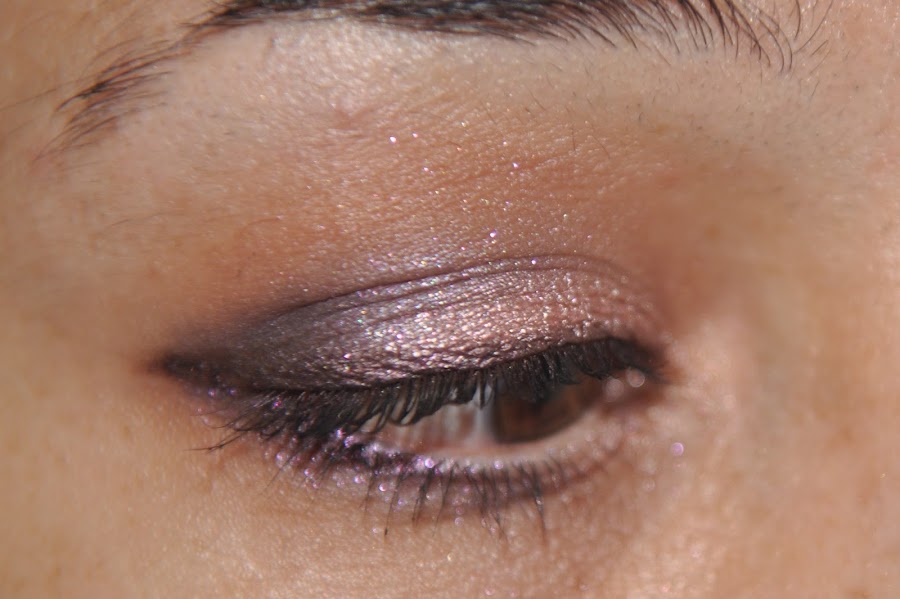 Es una sombra preciosa formada por varias tonalidades: violeta con reflejos rosados y,eso sí,tiene purpurina.