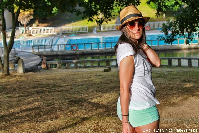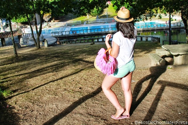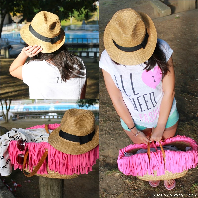 Llevo camiseta "All I Need Is Fashion" con detalles rosas, shorts en color verde mint, flip-flops en rosa, capazo customizado con trapillo rosa que tanto os gustó a través de mi Instagram cuando os lo enseñé y borsalino.