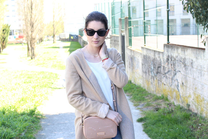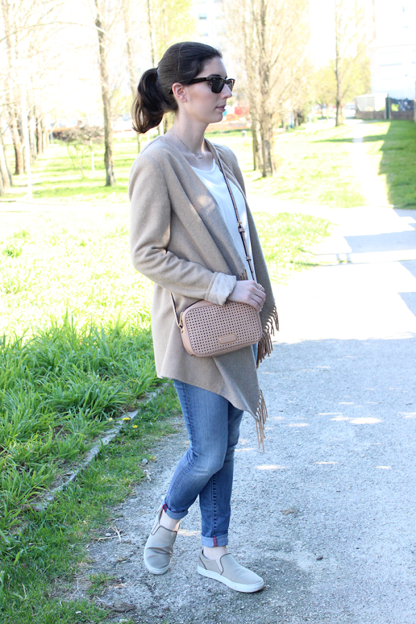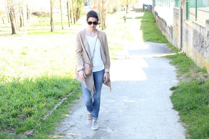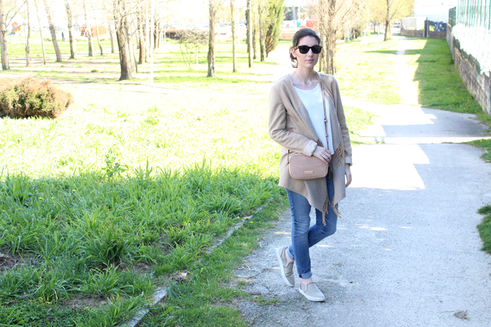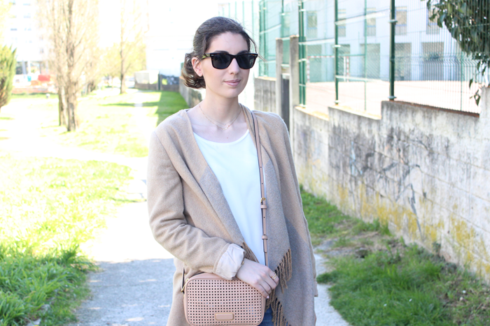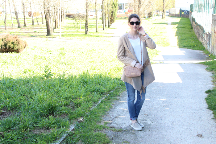 Nunca es demasiado tarde para hacerse con un poncho y esta es mi primera vez, nunca pensé en llevar uno pero este es muy mono y no es muy grueso, así que para primavera está genial. Y también estreno bolso, más bien bolsito por lo pequeño que es :)