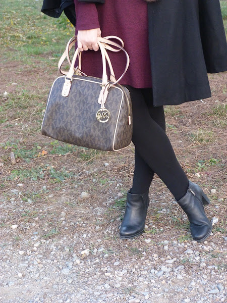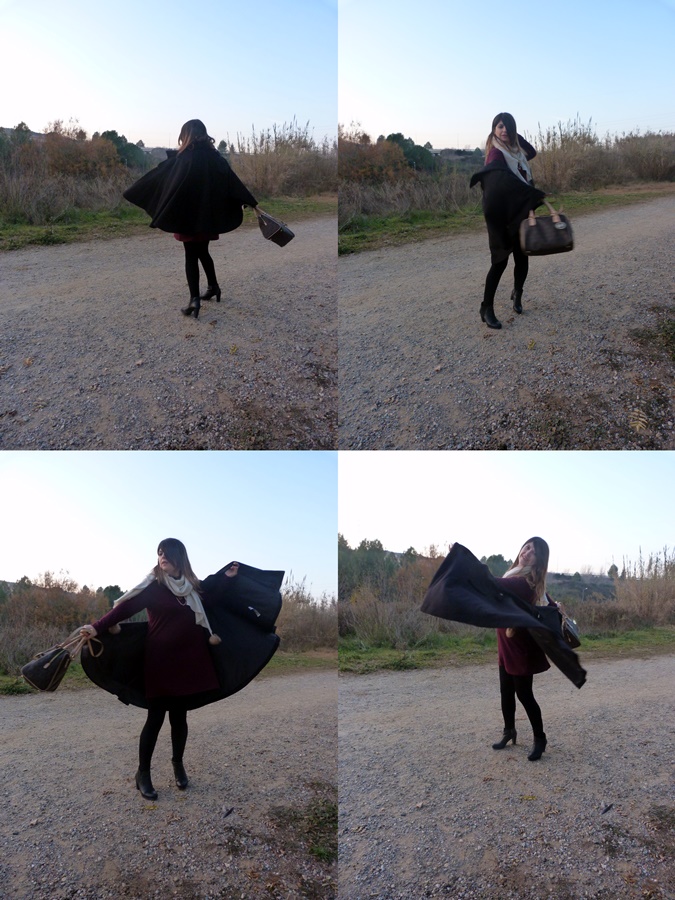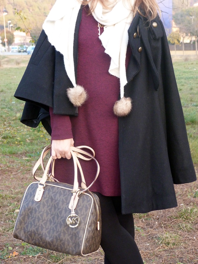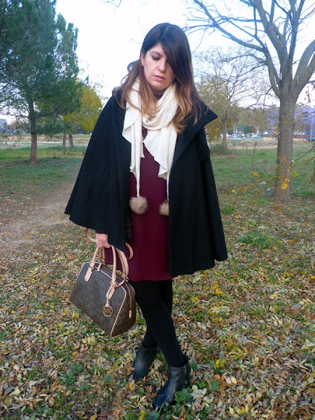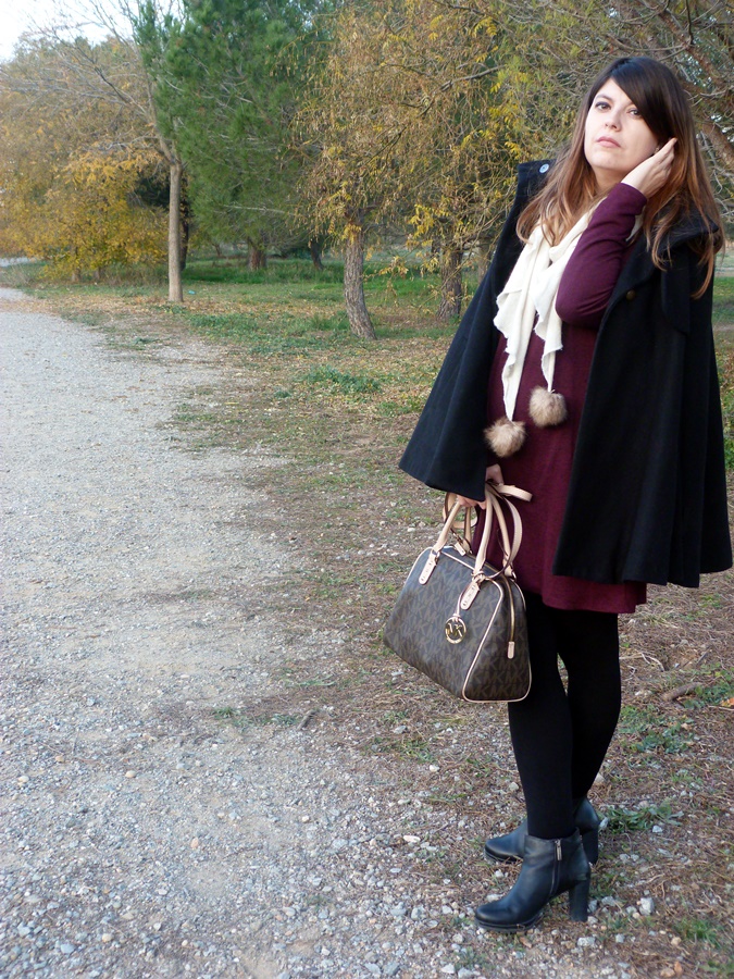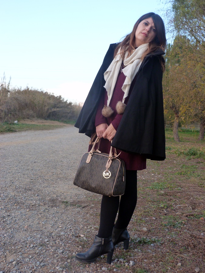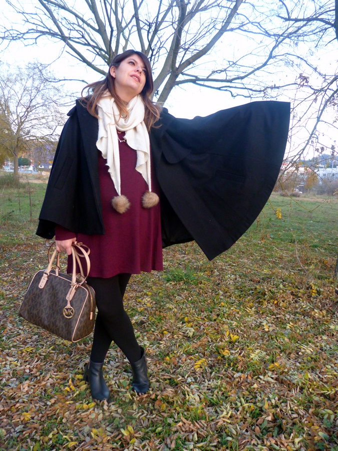 Ahora si, os dejo con el look de hoy, saqué de mi armario la capa de Stradivarius negra de hace mil, y la combiné con vestido de punto y cuello alto en color marsala, bufanda beig con pompones, botines y bolso Michael Kors, espero que os guste.