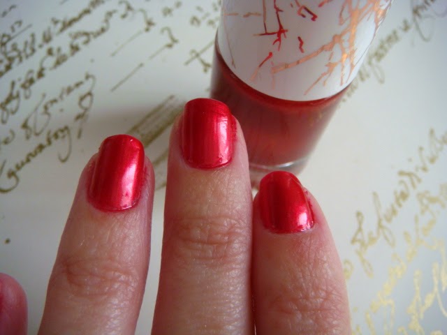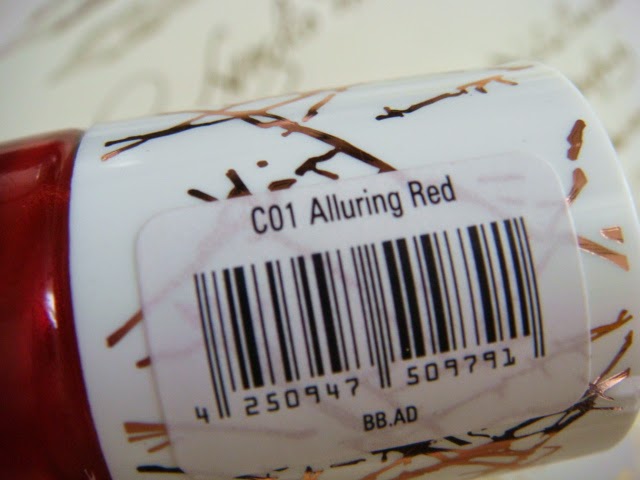 De entre los cinco esmaltes de la colección, me hice con el Alluring Red, el cual posee un color cereza metalizado simplemente espectacular. Es cremoso y tarda algo en secarse entre capa y capa, aunque la verdad es que con una sería suficiente, pero con dos el resultado es perfecto. Casa a la perfección con el labial del mismo nombre.