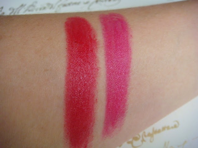 El primero es un elegante rojo con un punto frambuesa en el swatch, pero en los labios es algo más cálido; el segundo es un favorecedor rosa con subtono frío.