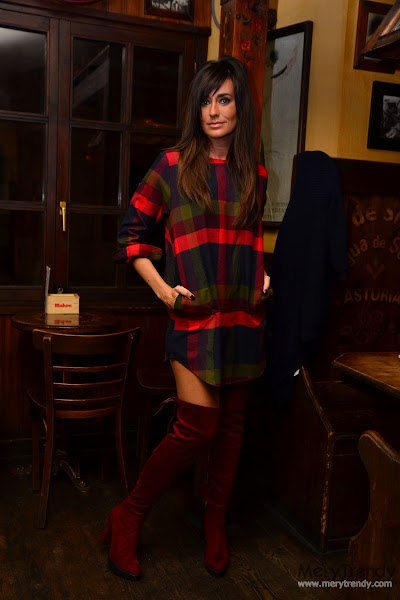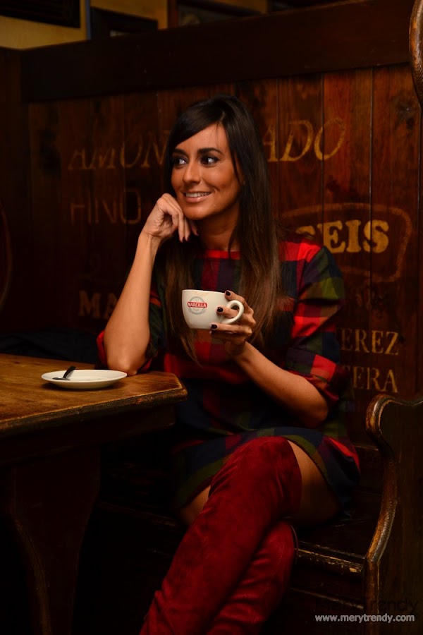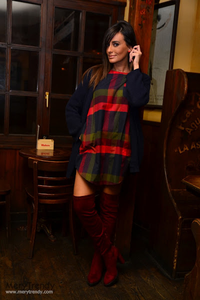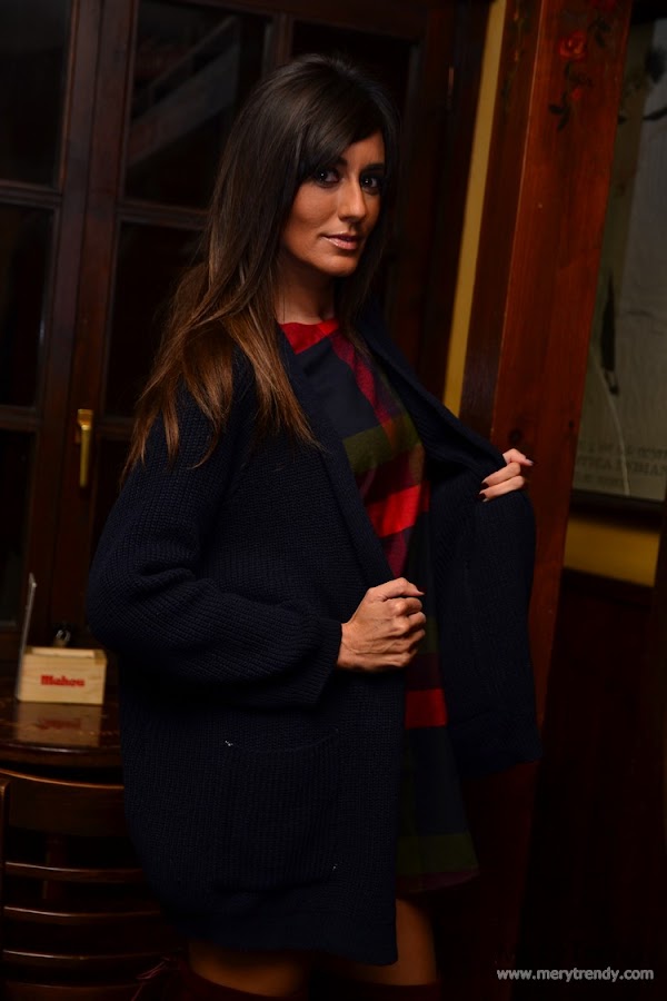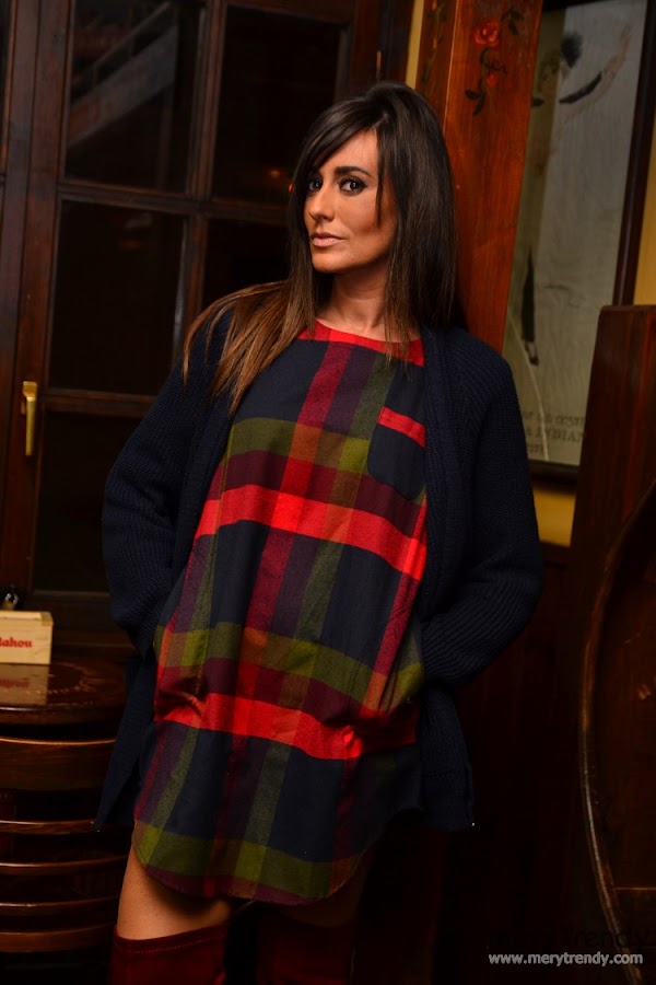 Aunque con mayor frecuencia os muestre mis looks más festivos, os aseguro que también me gusta mucho este otro estilo, más desenfadado, para el día a día entre semana, ahora en otoño, cuando voy por ejemplo a dar una vuelta y/o a tomar un café. Creo que un sencillo vestidito a cuadros, con un simple cárdigan con cómodos bolsillos laterales, nos puede dan mucho juego. Y ya, ni qué decir tiene que las botas de caña alta con tacón se han convertido en mi calzado favorito de un tiempo a esta parte... Lo habéis notado, ¿verdad que sí? Jijiji.