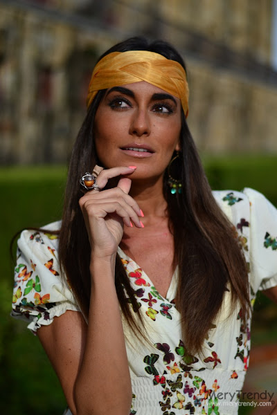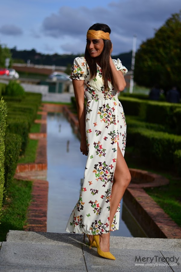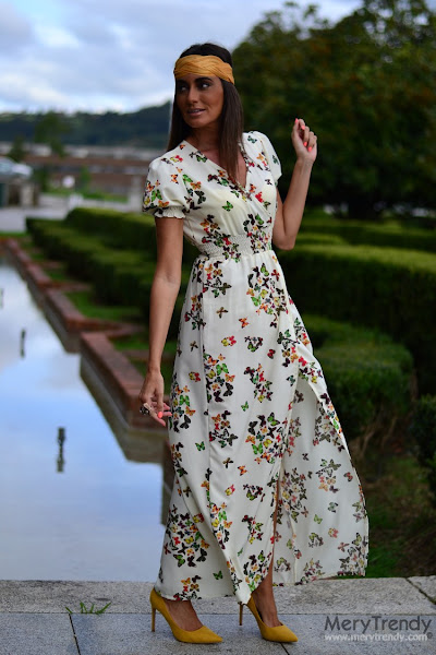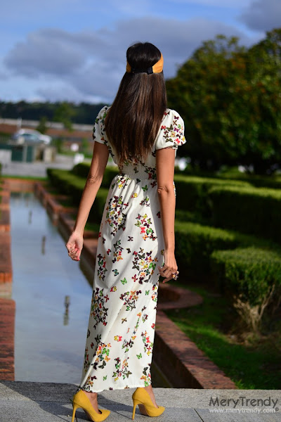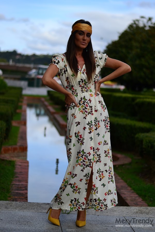 El maxi dress es de Castaño de Indias, una firma española con un estilo muy personal y femenino que me gustó por el corte (escote cruzado, fruncido en la cintura y manga corta), por el estampado de la tela y, sobre todo (algo que os parecerá una tontería), pero también porque era talla única... Jijiji (y ya sabéis lo indecisa que soy a la hora de decantarme por una u otra talla; tanto en lo que a prendas como a calzado se refiere... siempre me asaltan unas dudas tremendas). Os diré que vale para una S ó M, pero que también puede servir para una L.