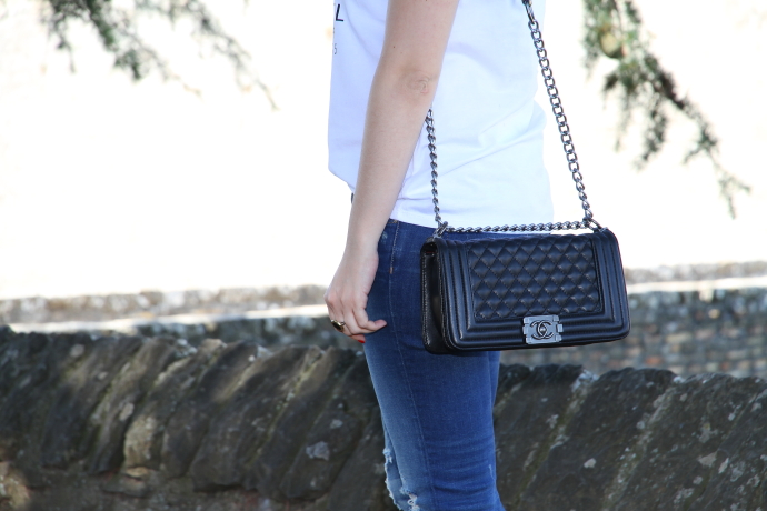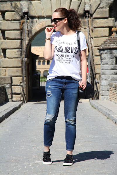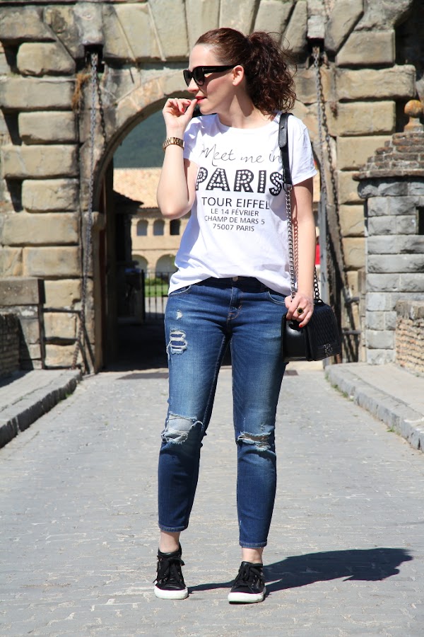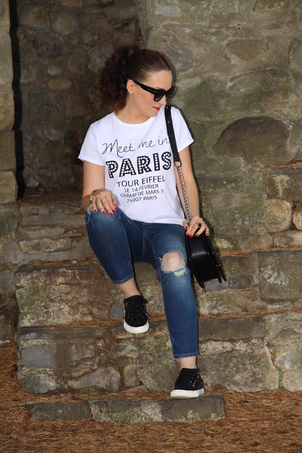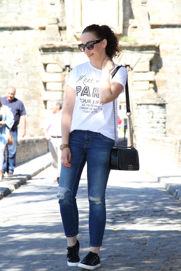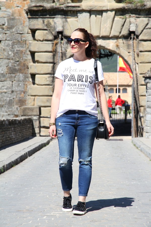 Hoy vengo con un look sencillo de los que me gusta llevar en mis ratos de ocio cuando quiero ir cómoda. Este fue el outfit elegido para pasar un día en la montaña disfrutando del paisaje y haciendo un poco de turismo. Como siempre confié en los tejanos, para mi la prenda por excelencia porque lo llevo a lo largo de todo el año y nunca me canso de ellos. Esta vez opté por jeans tobilleros que combiné con una camiseta con mensaje en blanco y negro. En los pies mis nuevas zapatillas, desde hacía tiempo me apetecían unas en color negro y al ver estas simplemente me enamoraron.