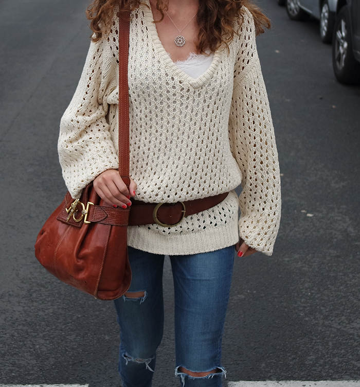 Good Morning! After one week in Madrid full of Wedding arrangements I back in Brussels for a few days. Going from the 40ºC if Madrid to 12ºC in Belgium it has been quite a shock so I had to think on a autumn look. Destroyed jeans with a cream oversize jumper, what do you think about the mix? If you are going to the north on holidays this kind of look always helps.Thank you for your vissits and comments, have a nice week.