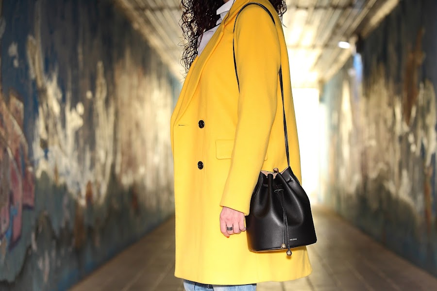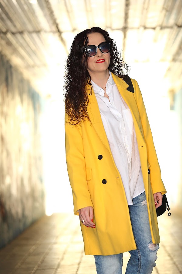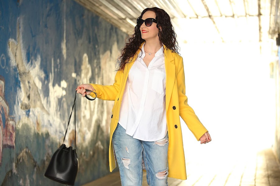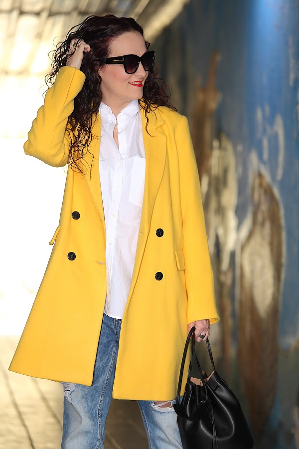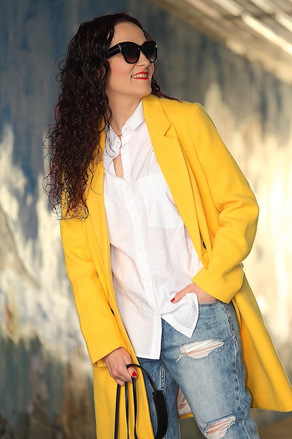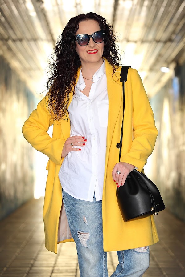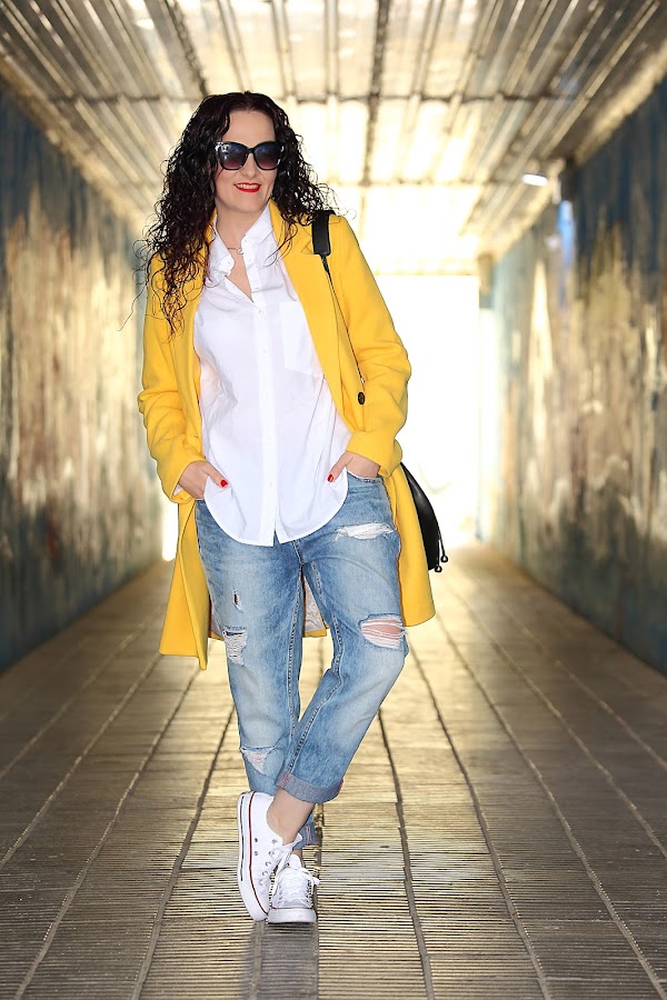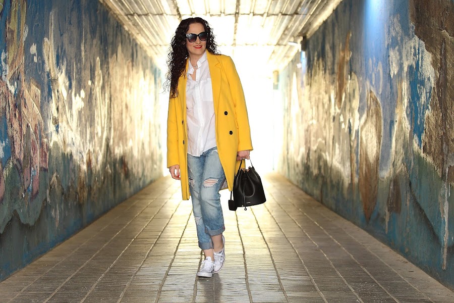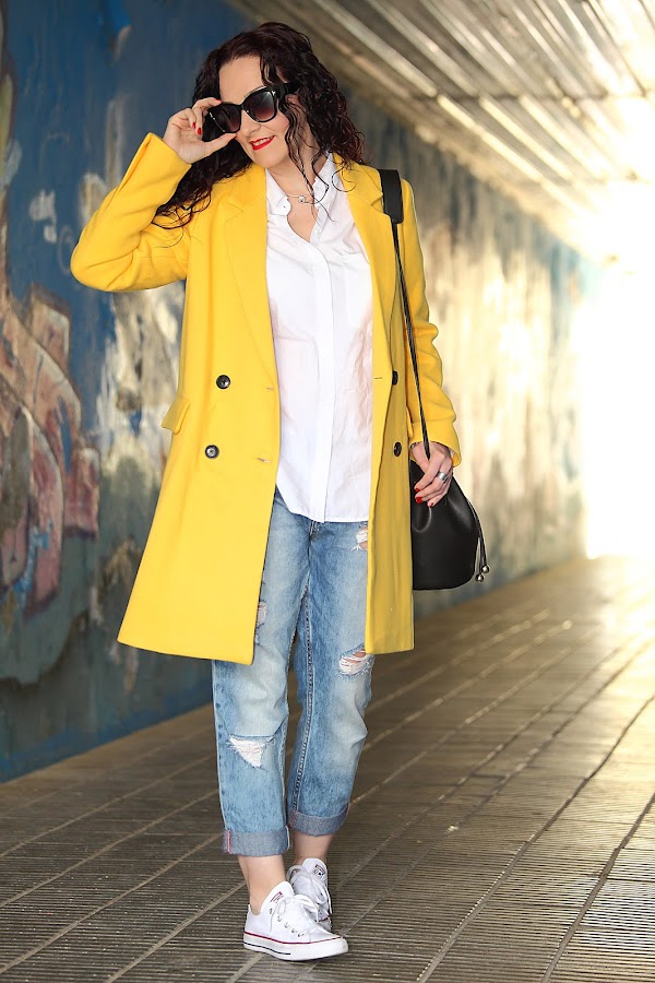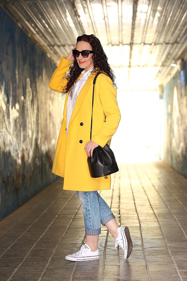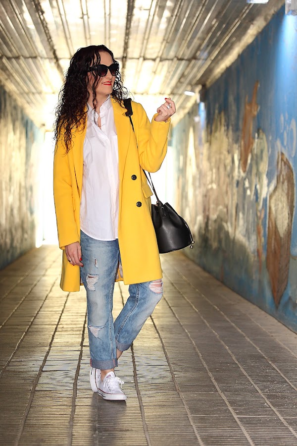 Hace unos días os mostré este abrigo amarillo combinado con un total look negro, hoy en cambio os lo enseño con un look casual mucho más relajado. Lo llevo con mi nueva camisa oversize, jeans boyfriend y Converse blancas. Además, le he añadido mi nuevo bolso bombonera que me chifla por el tamaño y su forma tan redondita.