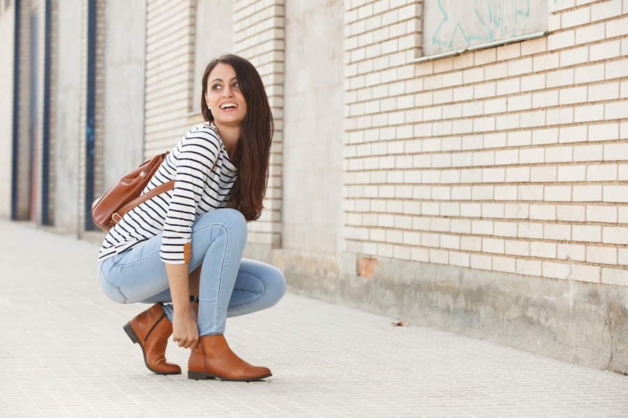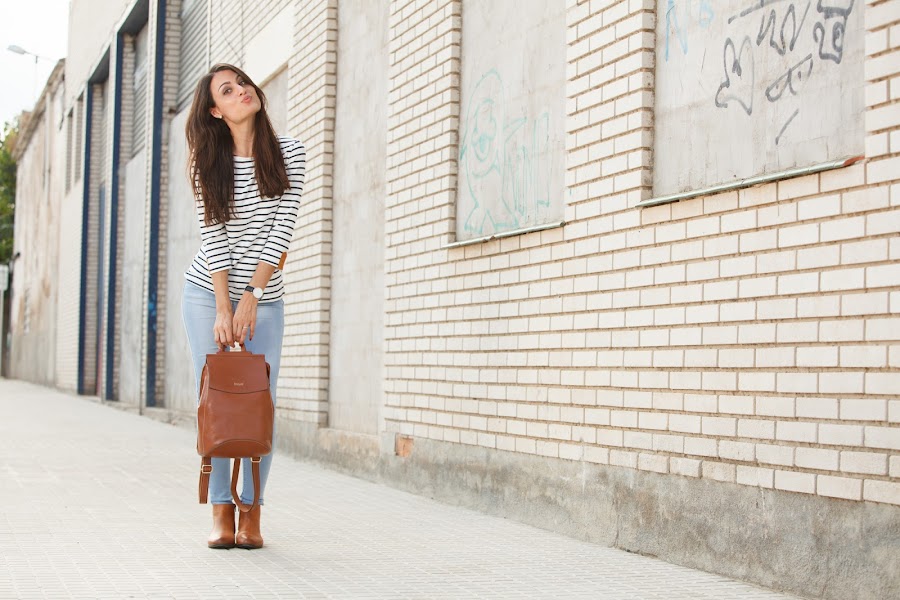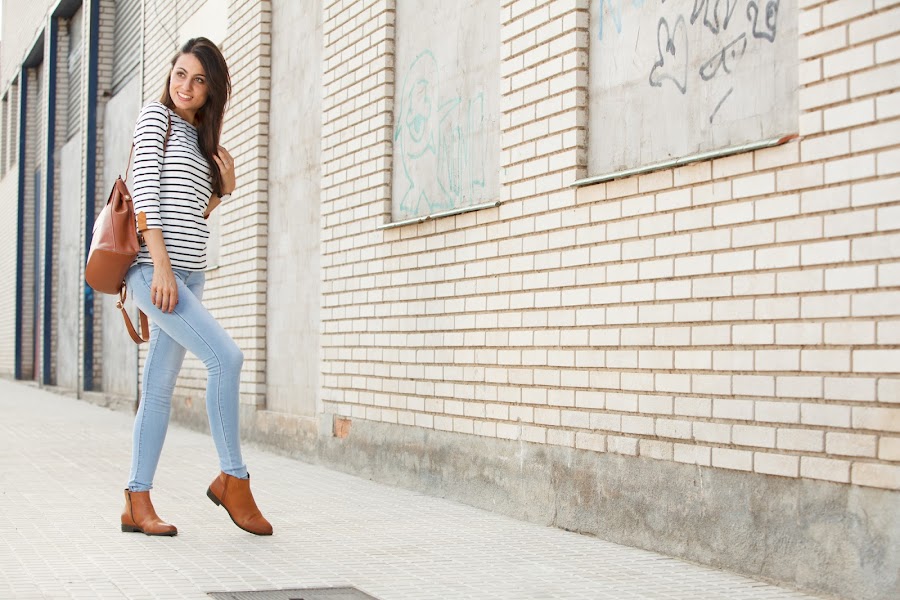 En el look camiseta navy, unos jeans SAMMYDRESS, mis botines camel VIA SPIGA y mi mochila BINNARI.