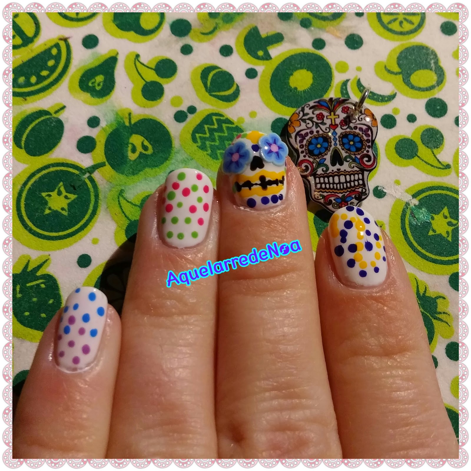 Comenzamos con la base de uñas y dos capas de 23 gel play y a continuación nos ponemos a juguetear con los dotting tomando el colgante de la Catrina como modelo, los ojos serán unas flores de fimo.