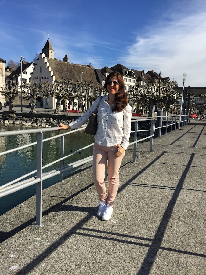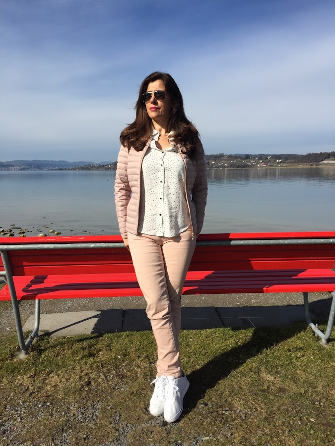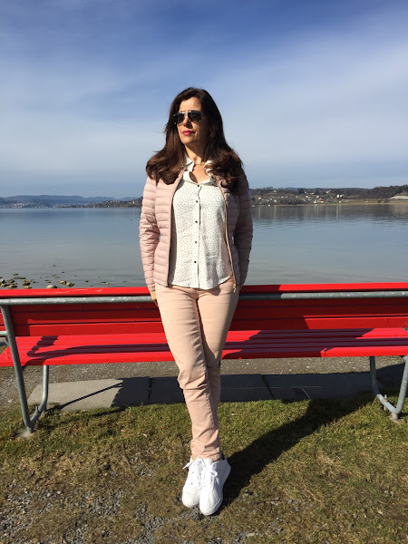 Hoy os muestro un look en tonos rosas. Llevo una cazadora rosa acolchada sin cuello súper ligera y pantalón rosa pitillo. La camisa tiene cuello bebé y estampado de corazones.