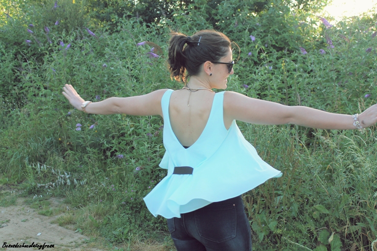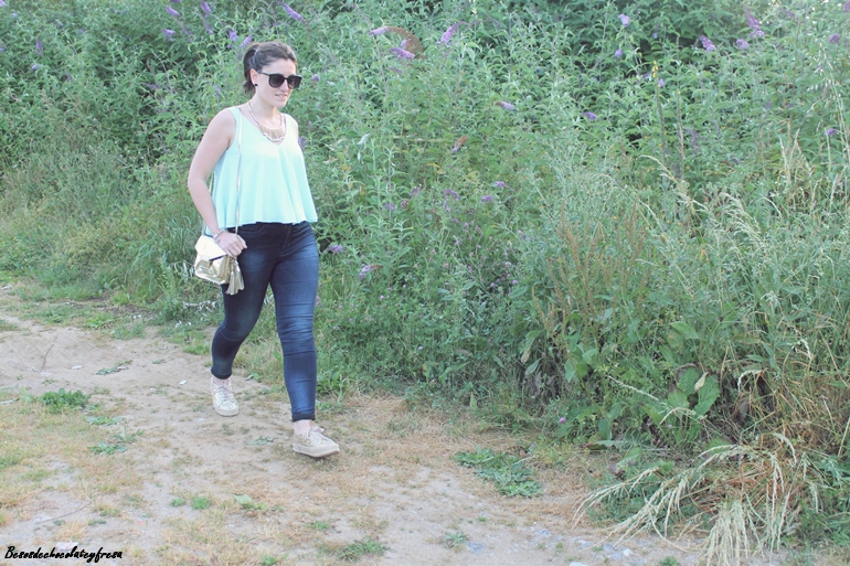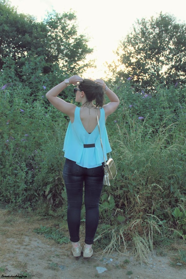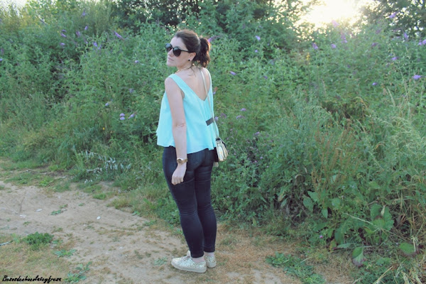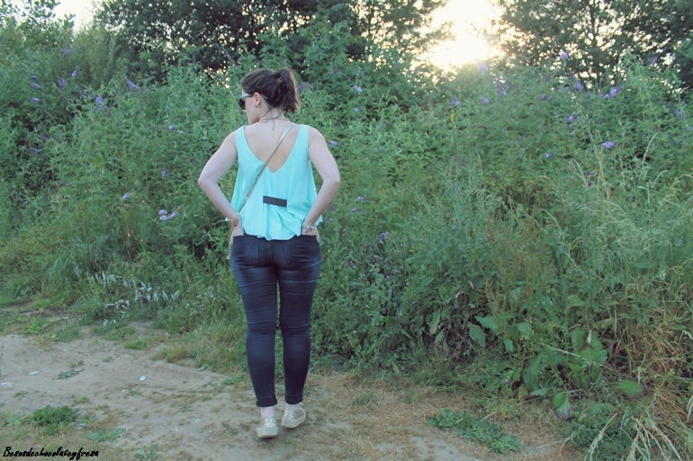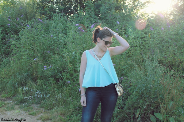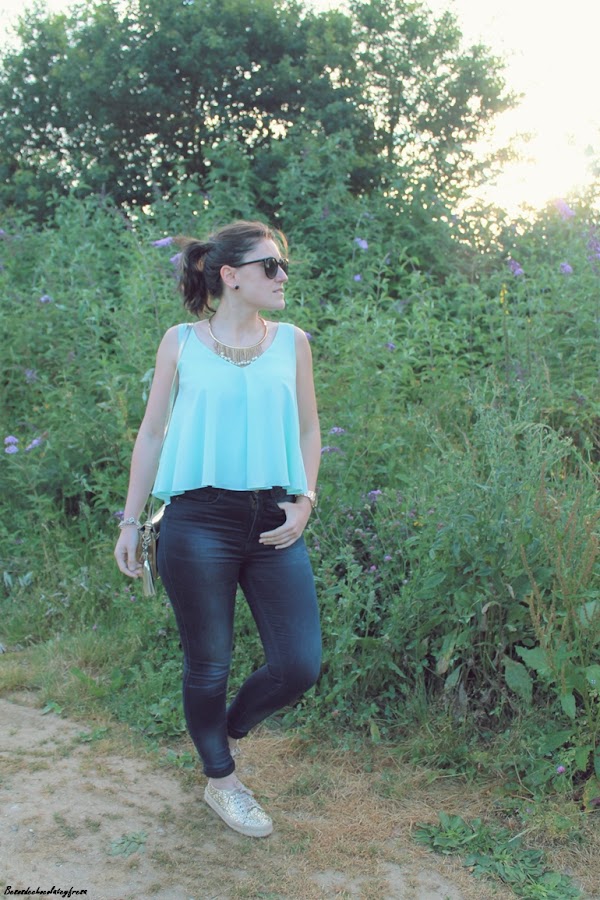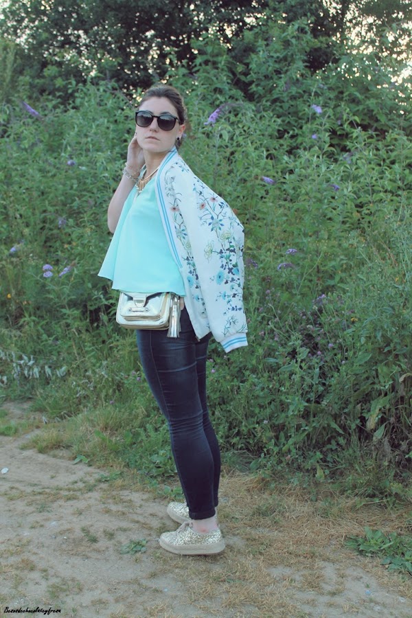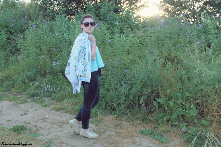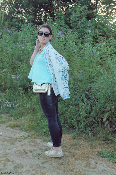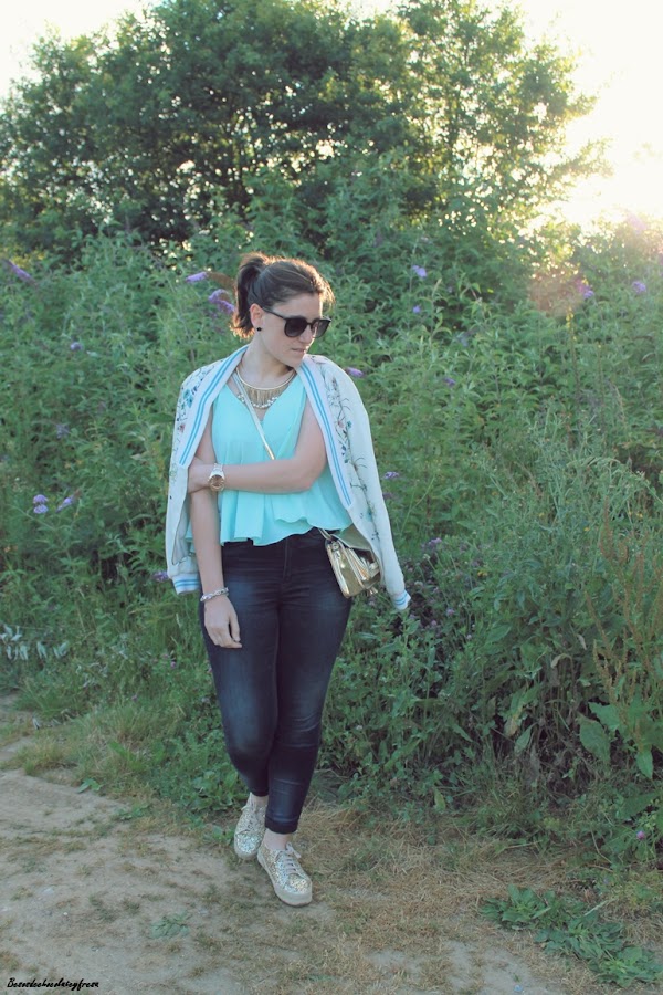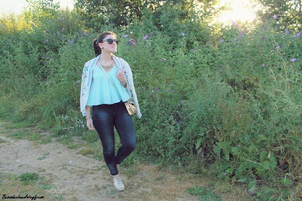 Llevo jeans con top de sisas y vuelo en color celeste, un color super favorecedor, sobre todo cuando se va cogiendo tono en la piel, chaqueta en los mismos tonos con estampado floral y de animales que verano tras verano es un aliado en los días más frescos. Y como nota de luz, espardeñas cerradas en dorado a juego con el collar y el bolso.