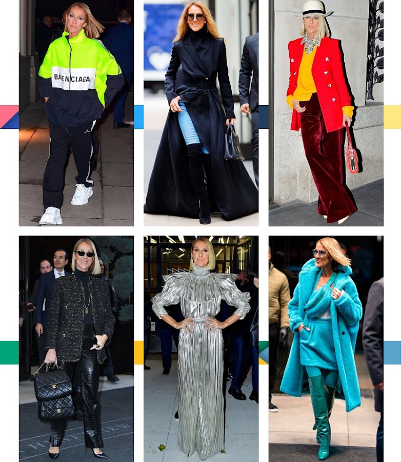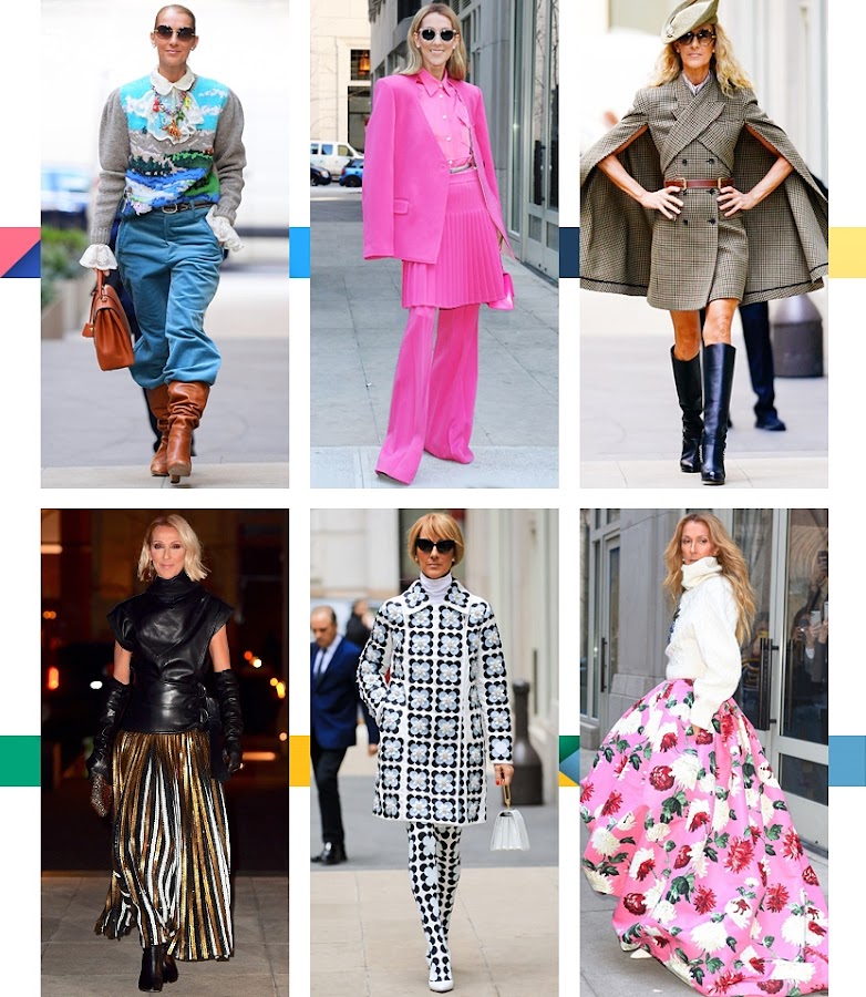 Los nuevos estilismos de Celine Dion juegan con los estampados, tejidos y mezclas más atrevidas.