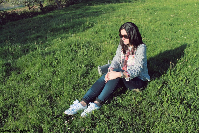Completo el look con jeans oscuros, camiseta y sneakers en blanco y bolso en gris con pompon. ¿Qué os parece el resultado?