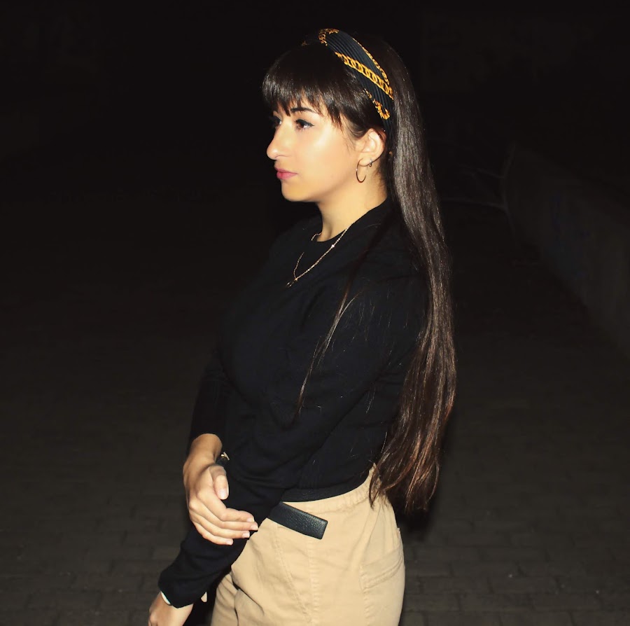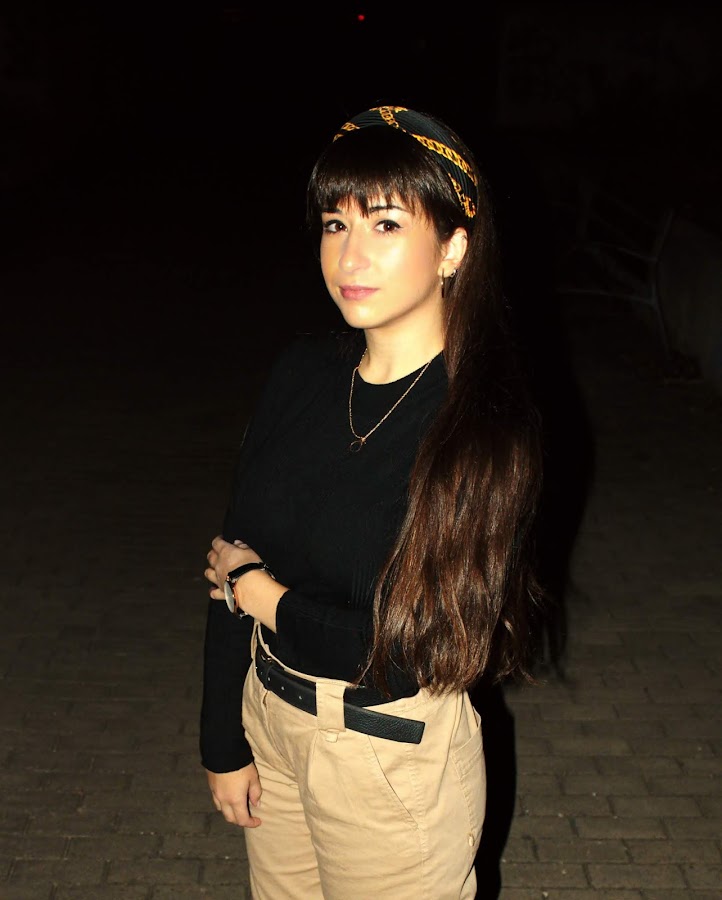 Se compone de unos pantalones beige que han sido un must-have esta temporada, combinándolo con un pañuelo de estampado de cadenas doradas que se ha convertido en el estampado de moda.