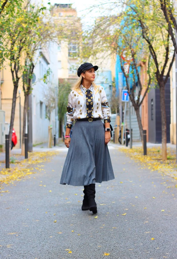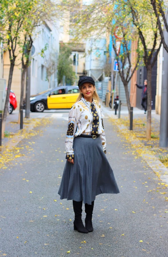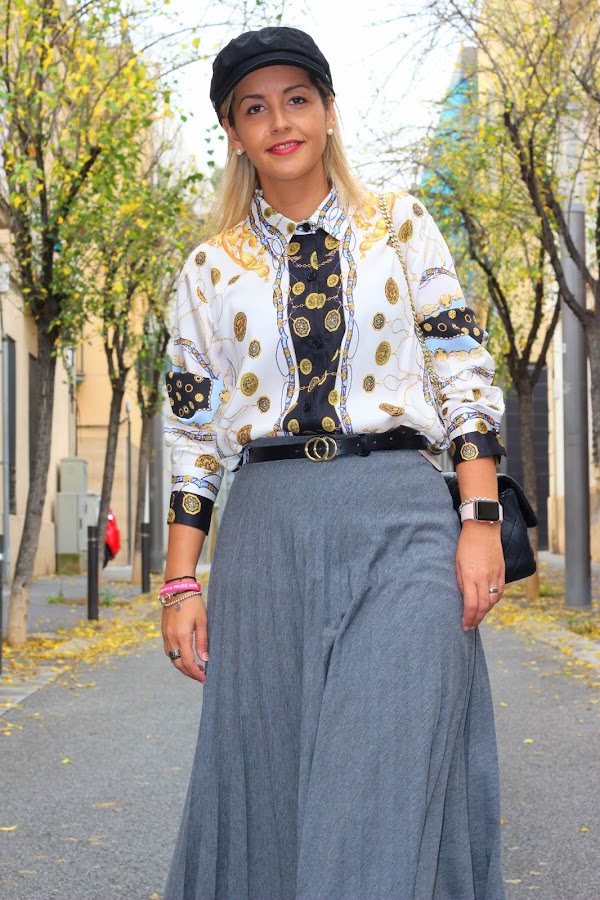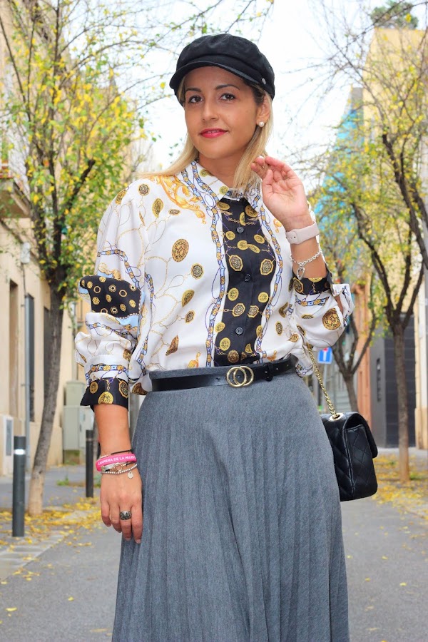 Hoy os traigo un look con una de las tendencias de la temporada: el estampado de cadenas. En el look de hoy llevo mi nueva camisa con estampado de cadenas, una tendencia que no puede faltar en vuestro armario esta temporada, que combiné con una falda gris plisada. Los accesorios del look fueron mis botas negras, mi bolso negro favorito y una gorra marinera.