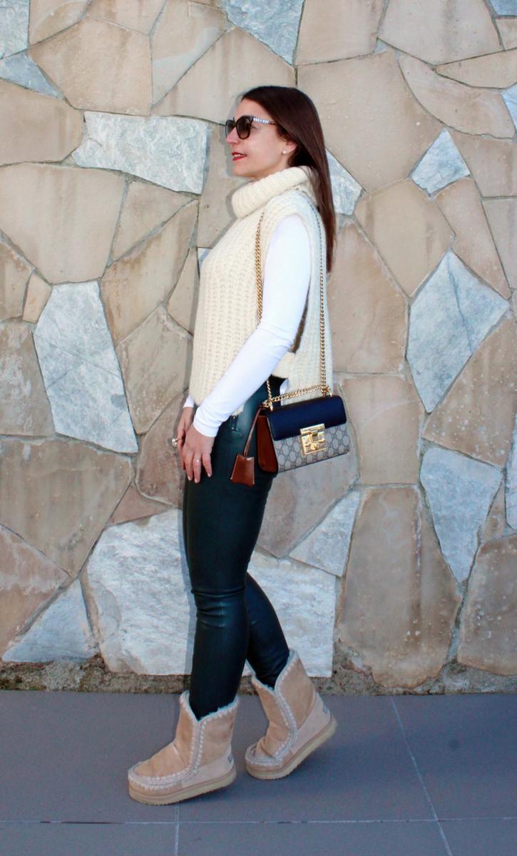 Compuesto por pantalones de polipiel ( como os decía al inicio de semana, han estado muy presentes en mis últimas compras) en color verde musgo con camiseta de manga larga por debajo del chaleco de lana con cuello subido. Por qué me gustó éste en concreto? pues por el detalle lateral, que no es completamente cerrado, sino que lleva una tira de unión entre la parte delantera y trasera, un pequeño detallito que me pareció muy gracioso y le daba otro punto al chaleco.