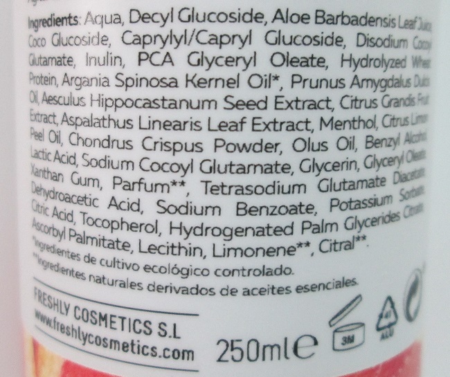 Lo que más me ha encantado de él, es su aroma cítrico-afrutado, tan rico y agradable, como una mezcla de pomelo, limón y algo de melocotón, jejeje. Además, está enriquecido en aloe vera, aceite de argán, té rooibos, mentol natural, castaño de Indias, entre otros; unos ingredientes ideales para todo tipo de pelo, incluso el cuero cabelludo sensible. Pero, también, ayuda a aportar brillo y dejar un cabello más sano, suave, cuidado y fuerte. Y, ¡así es!.